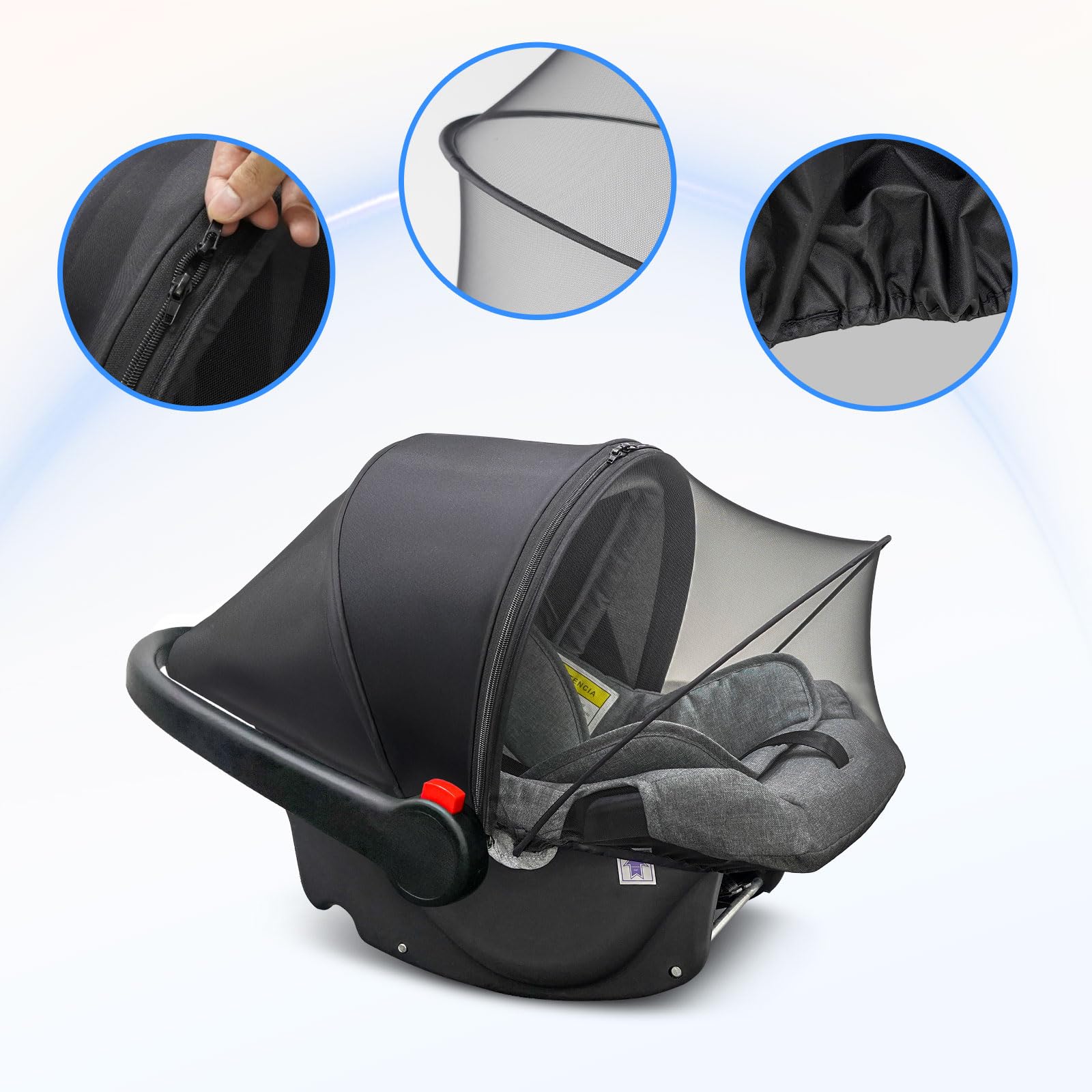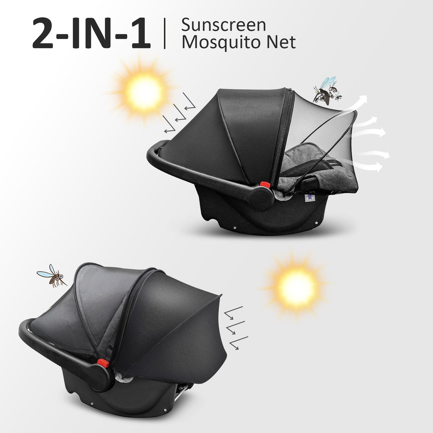 - All-Season Multi-Protection: This car seat cover baby provides both sunshade and mosquito net protection. Sealed bottom design blocks gaps for 100% bug-proof defense. Guards against wind, pet hair, and grass ticks during outdoor adventures.Supported by PVC Strip, mosquito net can form a stable structure to offer strong protection, expand movement space