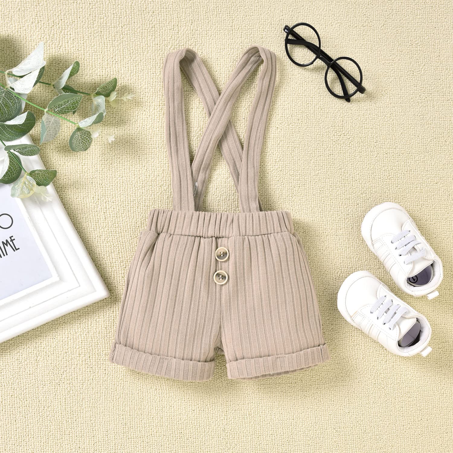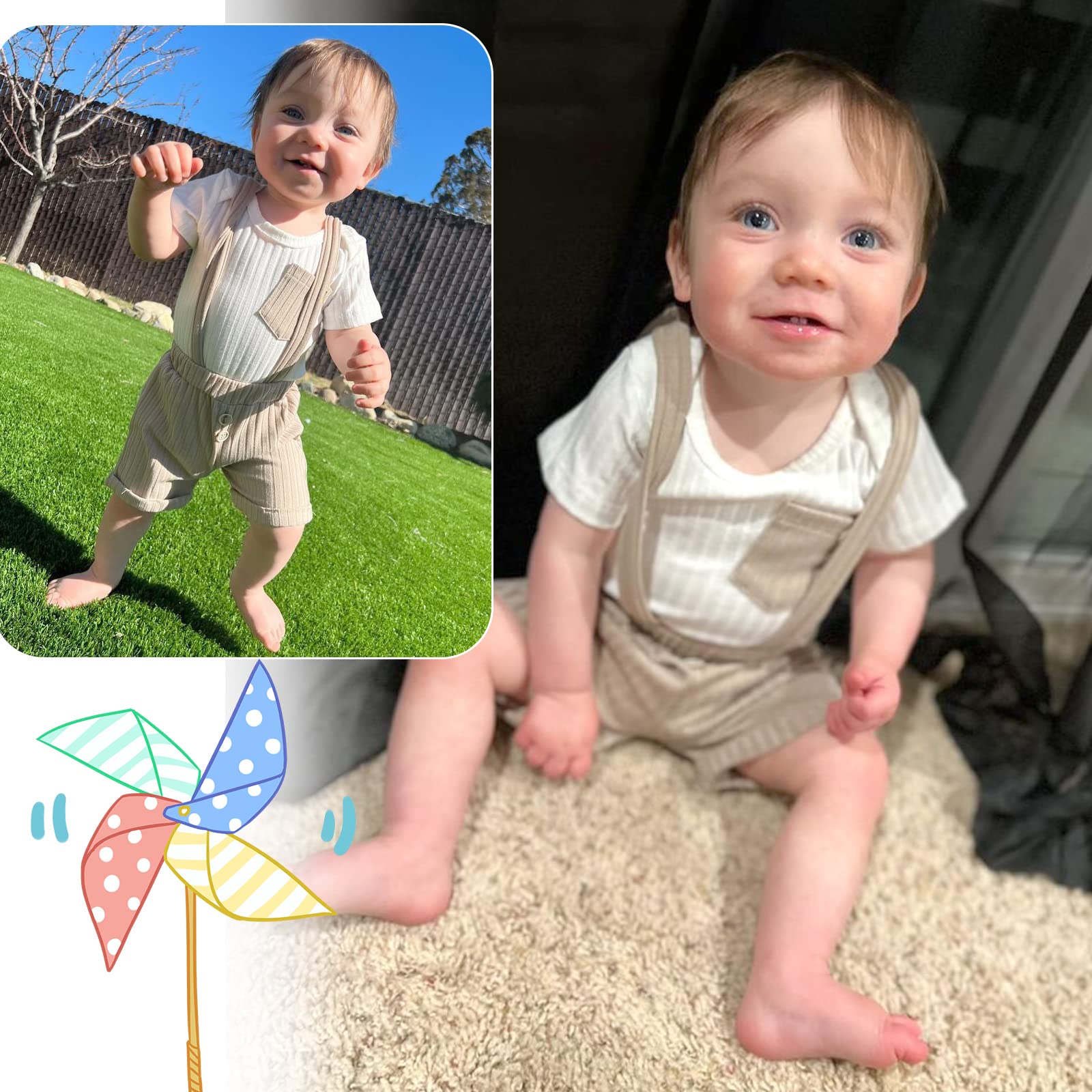- Baby boy summer clothes with three snap on at the bottom of clothes is convenient for changing diapers.Solid color suspenders can be used in parallel or crosswise,besides,the striped module on the knee of the pants goes well with the tops