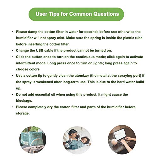 - TWO MIST-MODE: Intermittent mode (5 seconds on and 5 off) lasts up to 8-10 hours and continuous mode lasts up to 4-5 hours. Two modes provide you with the optimal levels of moisture as you desire.