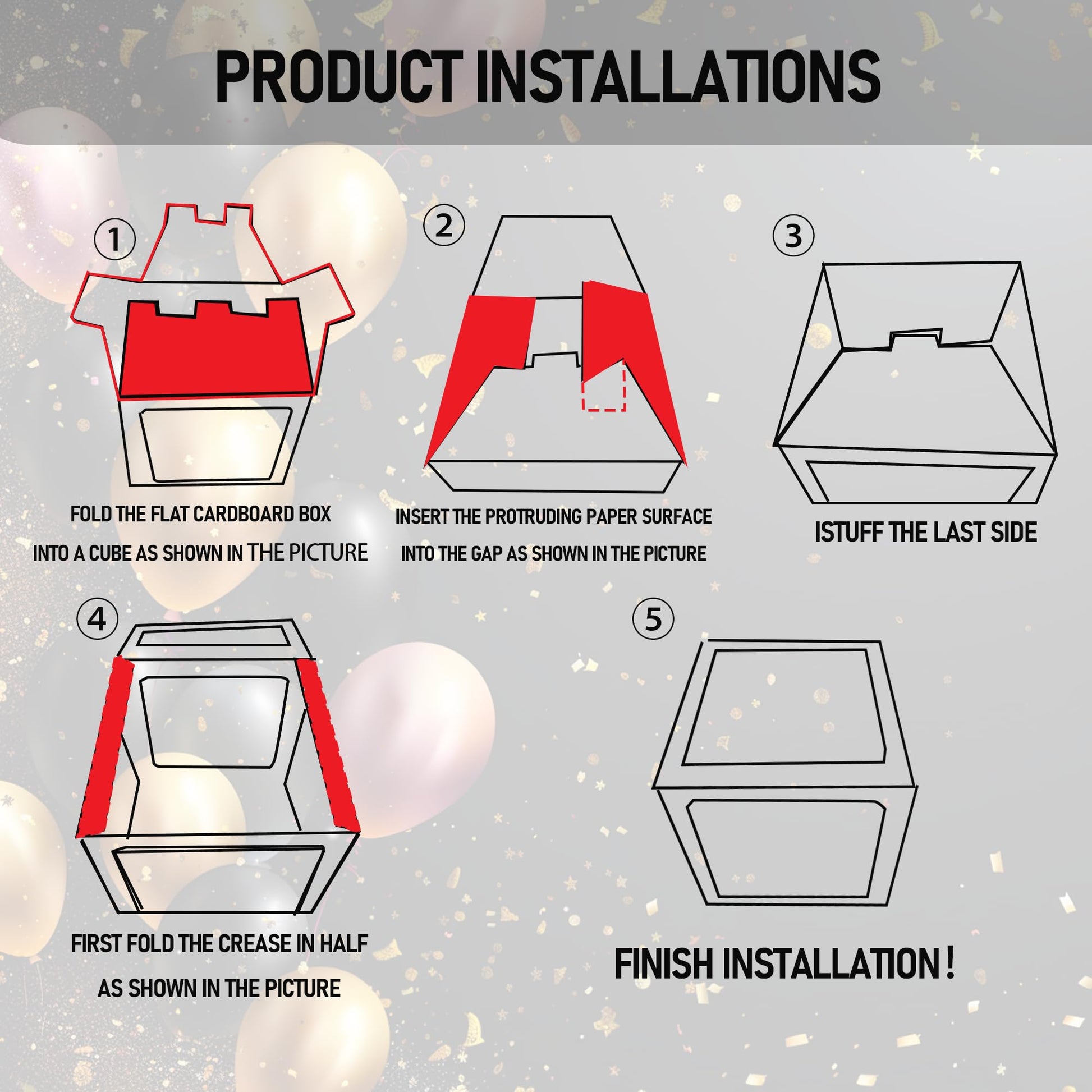 The baby shower box is pre-folded and easy to set up as our picture instruction shows, and you can also use the drop glue to put the letter baby or other whatever you want on the box, making your party impressed.
