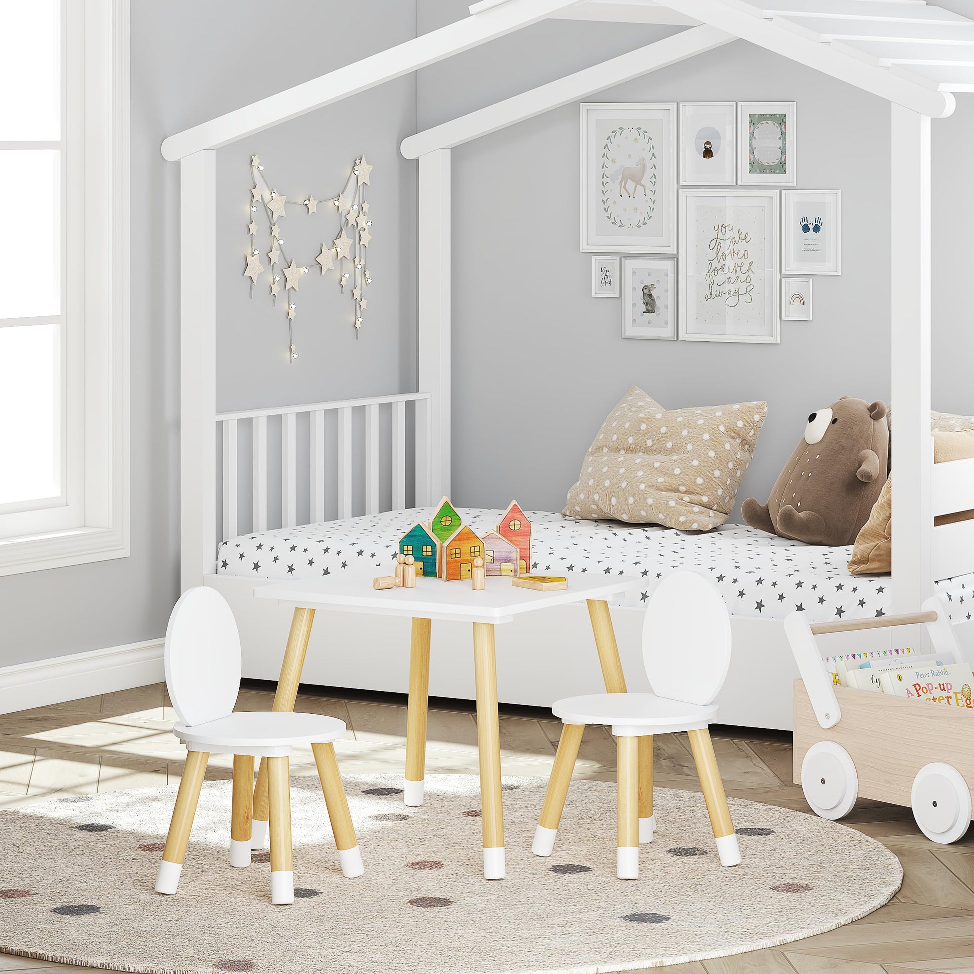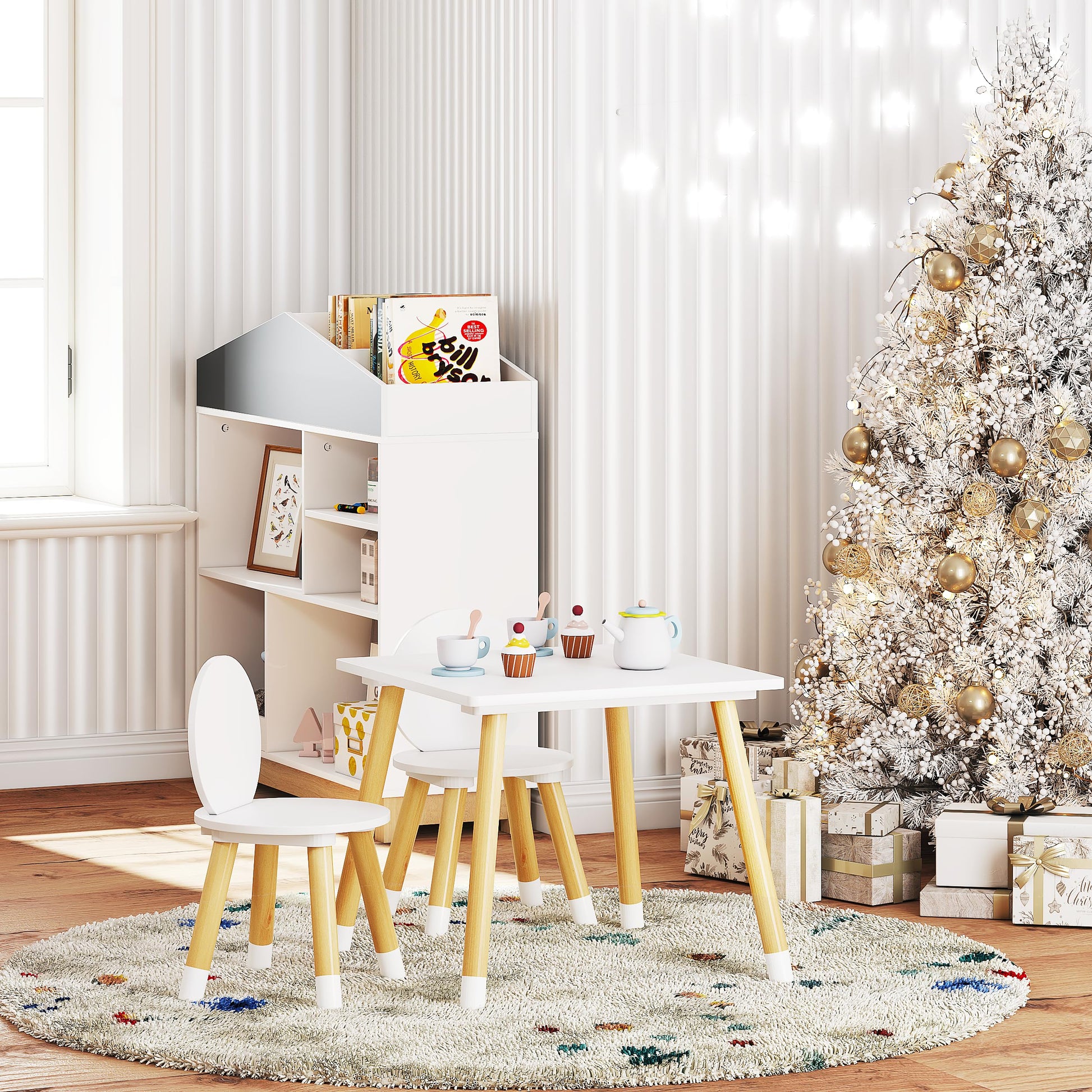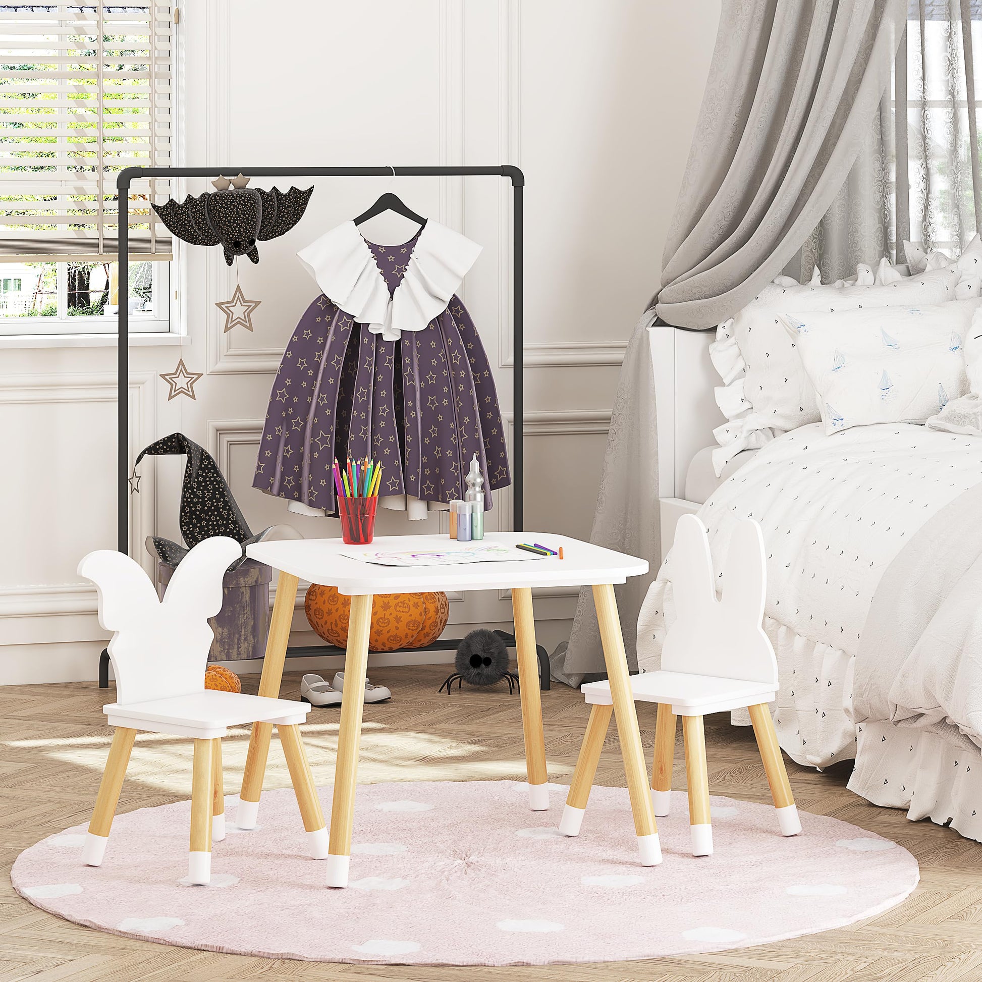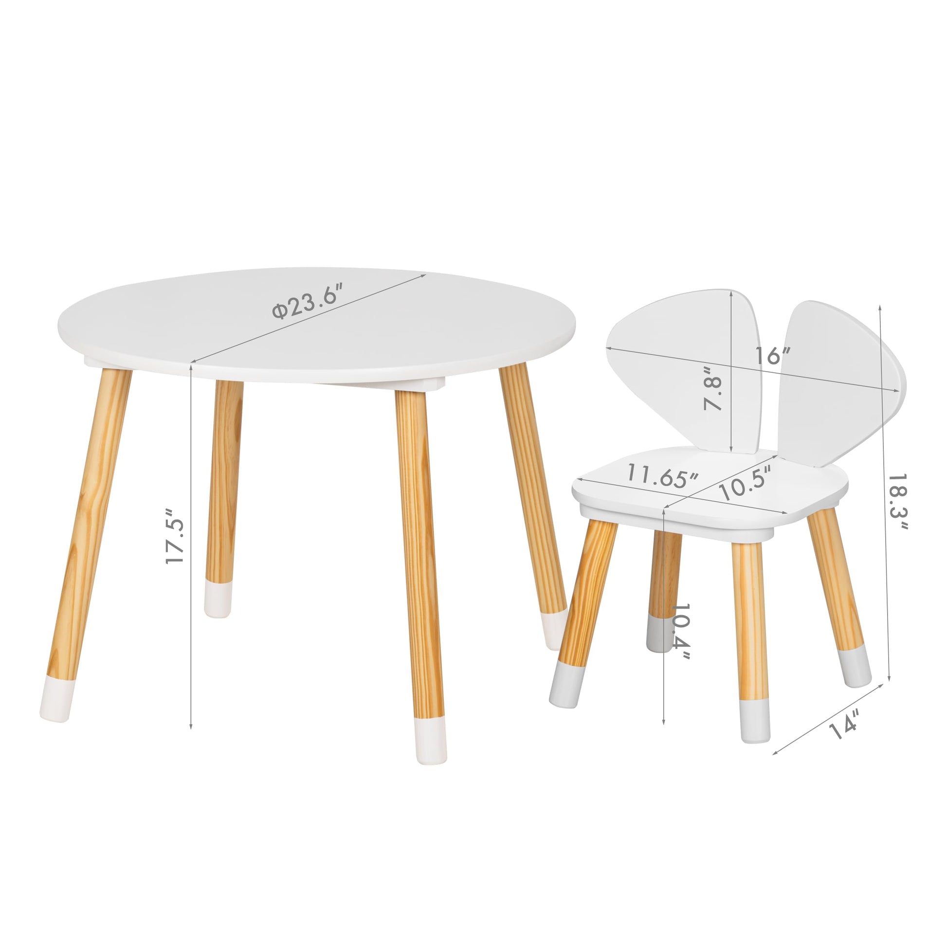 We take into account that children around 3-10 years old are very naive and lively, so we designed this kid's table and chairs with cute shapes, which are perfect for toddlers. Two bear-shaped chairs can greatly stimulate the curiosity of children but are also good educational toys. At the same time, the table with a rounded curvature around does not worry the kids because the corners of the table are too sharp and get hurt.The whole kids' play table white is made of high-quality pine and artificial engineering wood, strong and durable, non-toxic and tasteless; This kid's table and chairs set is very easy to clean, just need to simply wipe it with a clean towel.