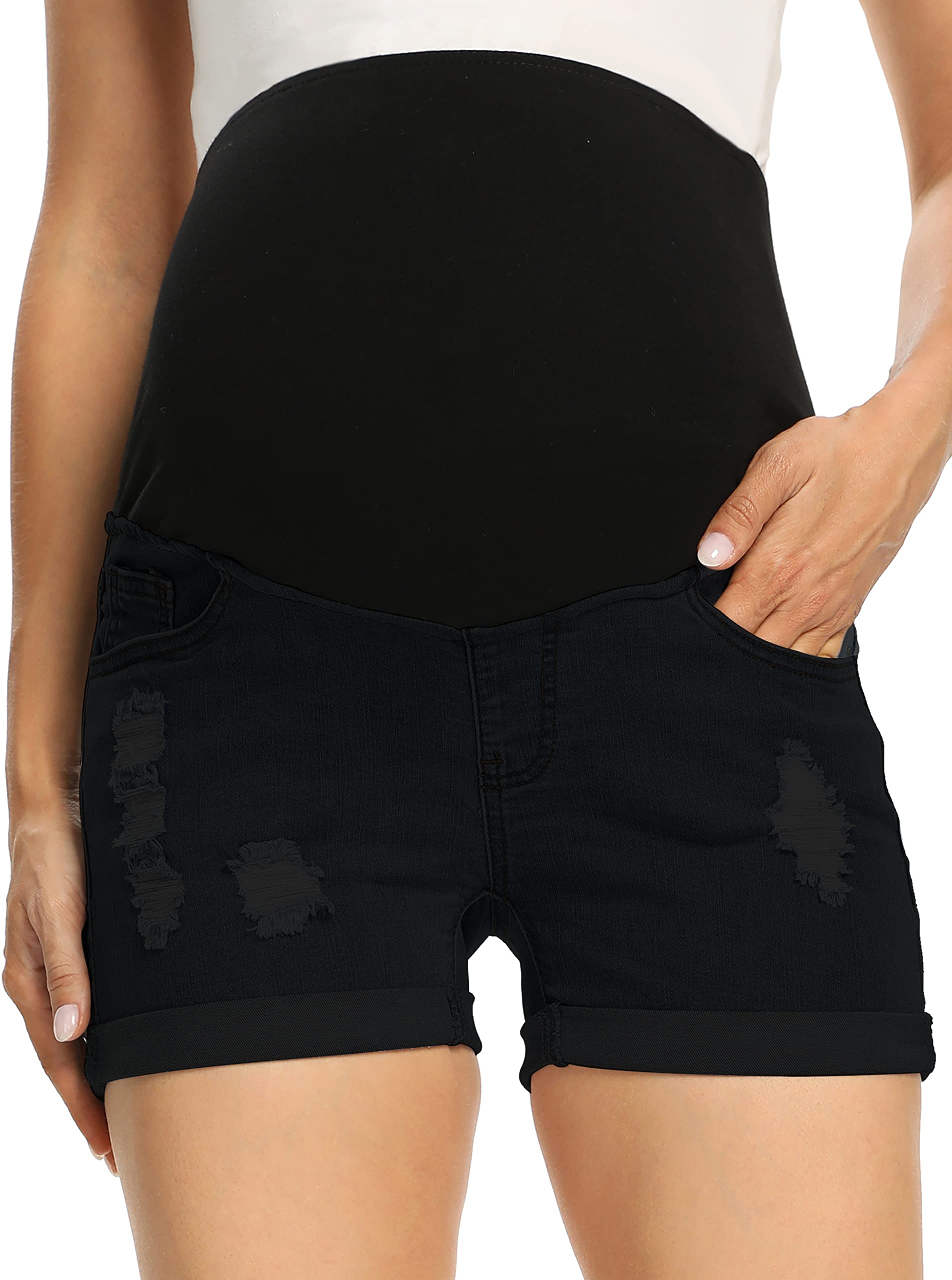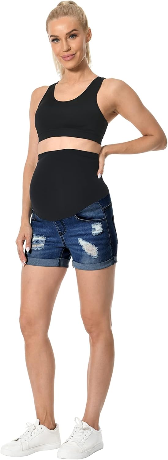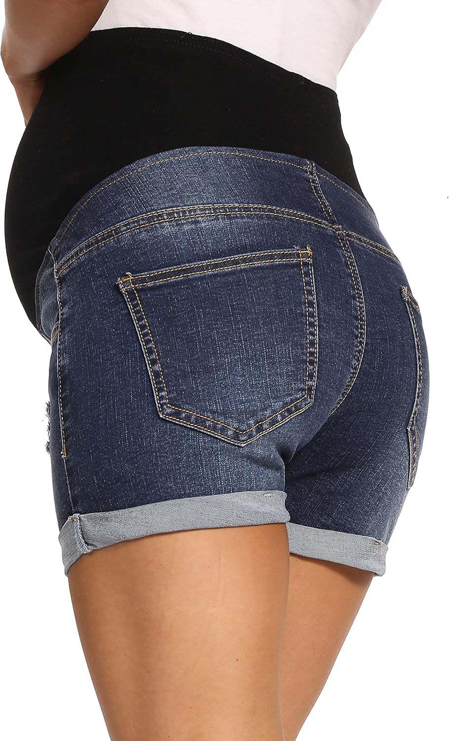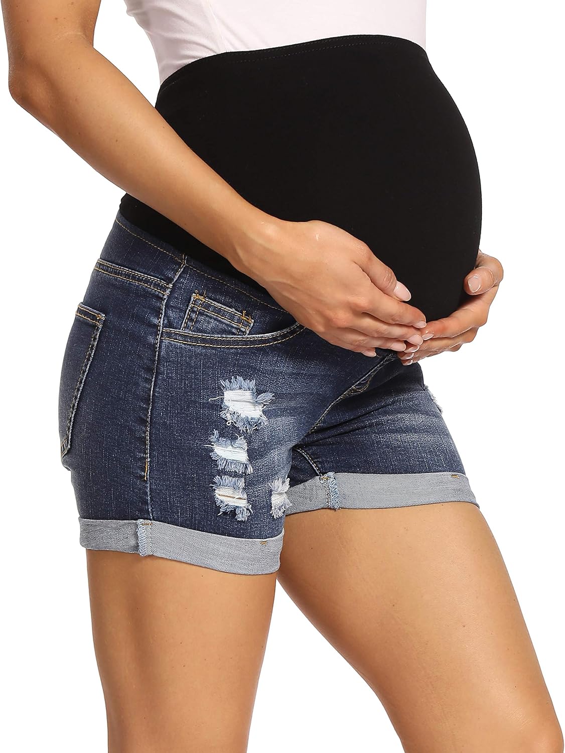 Maternity Women's Ripped Over Belly Denim Shorts Stretchy Cuffed Hem Jean Shorts
