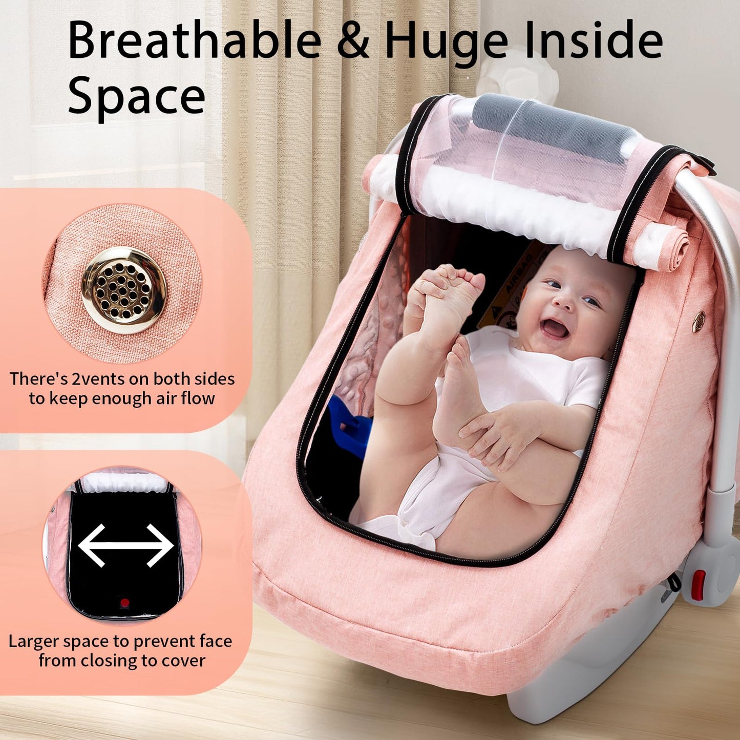 - Versatile Window Modes: The infant car seat cover comes with 3 window options to suit different conditions: a breathable mesh peek-a-boo window for warm weather, which also serves as a barrier against unwanted approaches; a closed window to shield from sunlight, rains, snow, protect against harsh weather or prying eyes; and a fully open mode can quickly put baby in/out.