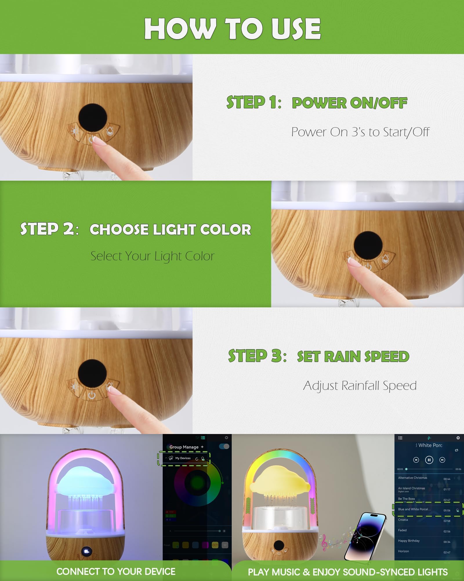 Control your ambiance effortlessly with our smart app or remote control. Choose from a spectrum of soothing colors, adjust the raindrop pace, and set the perfect lighting scene for any moment, all at the touch of a button