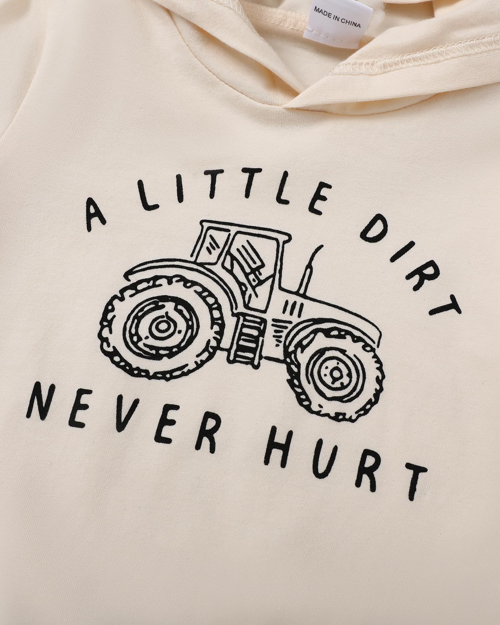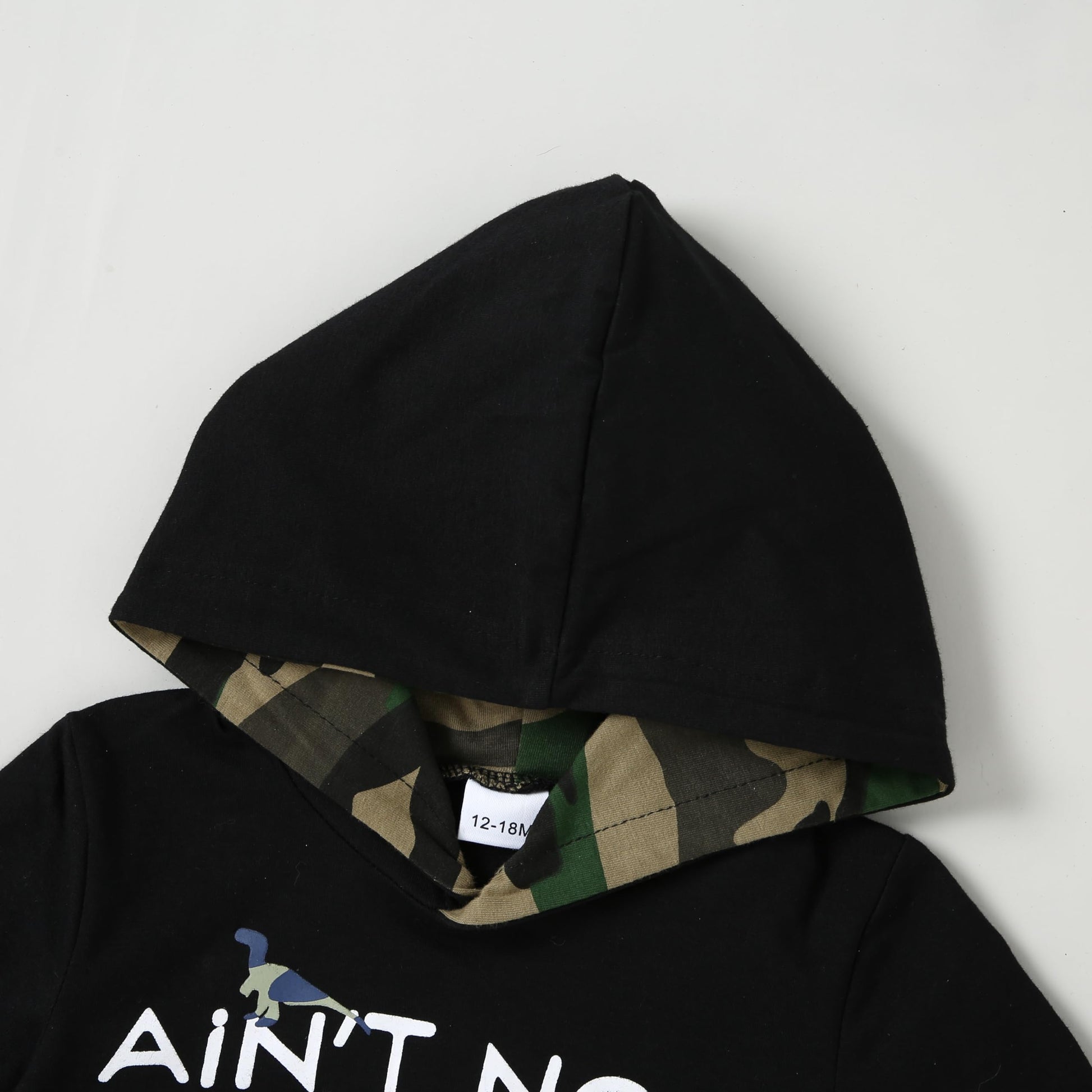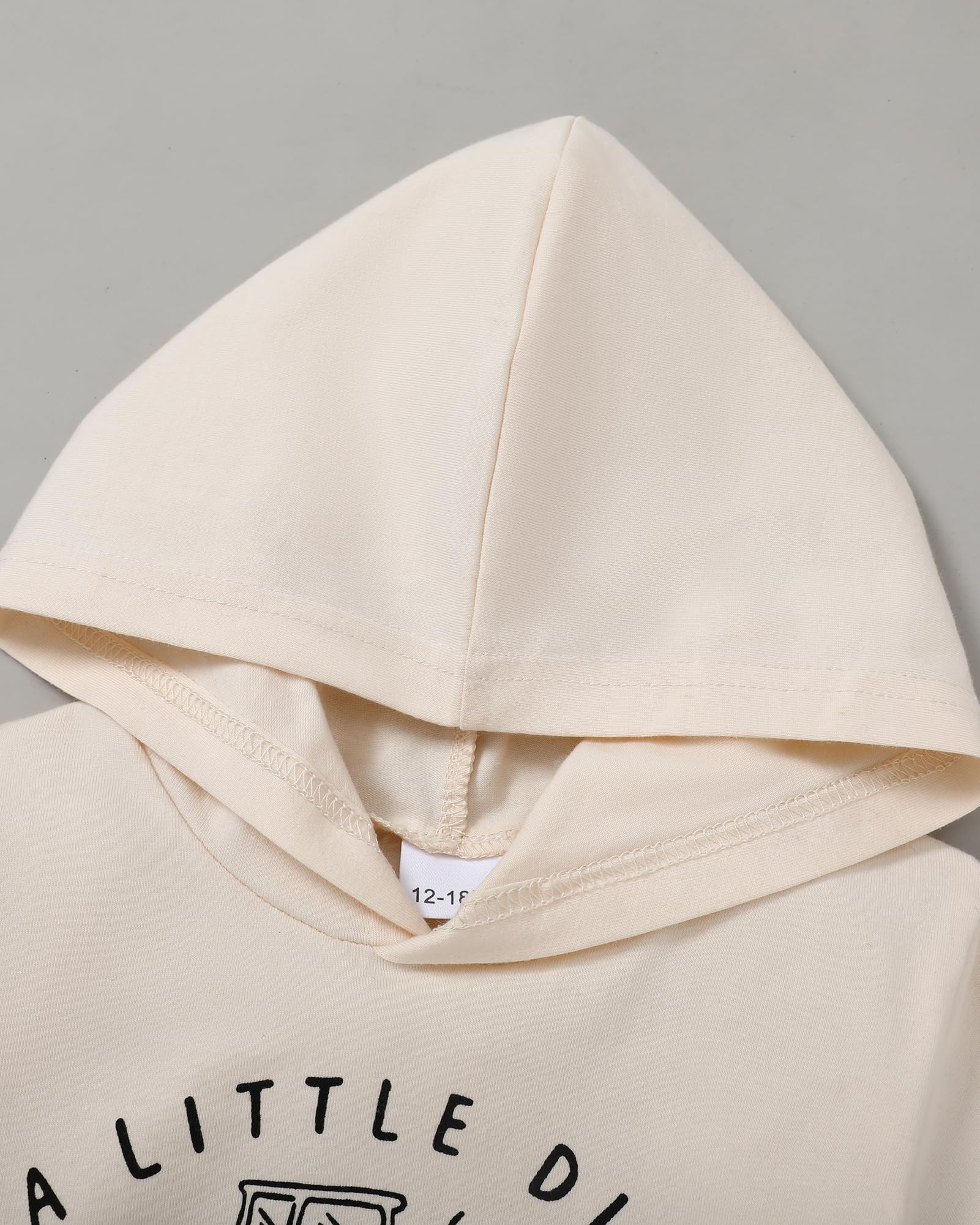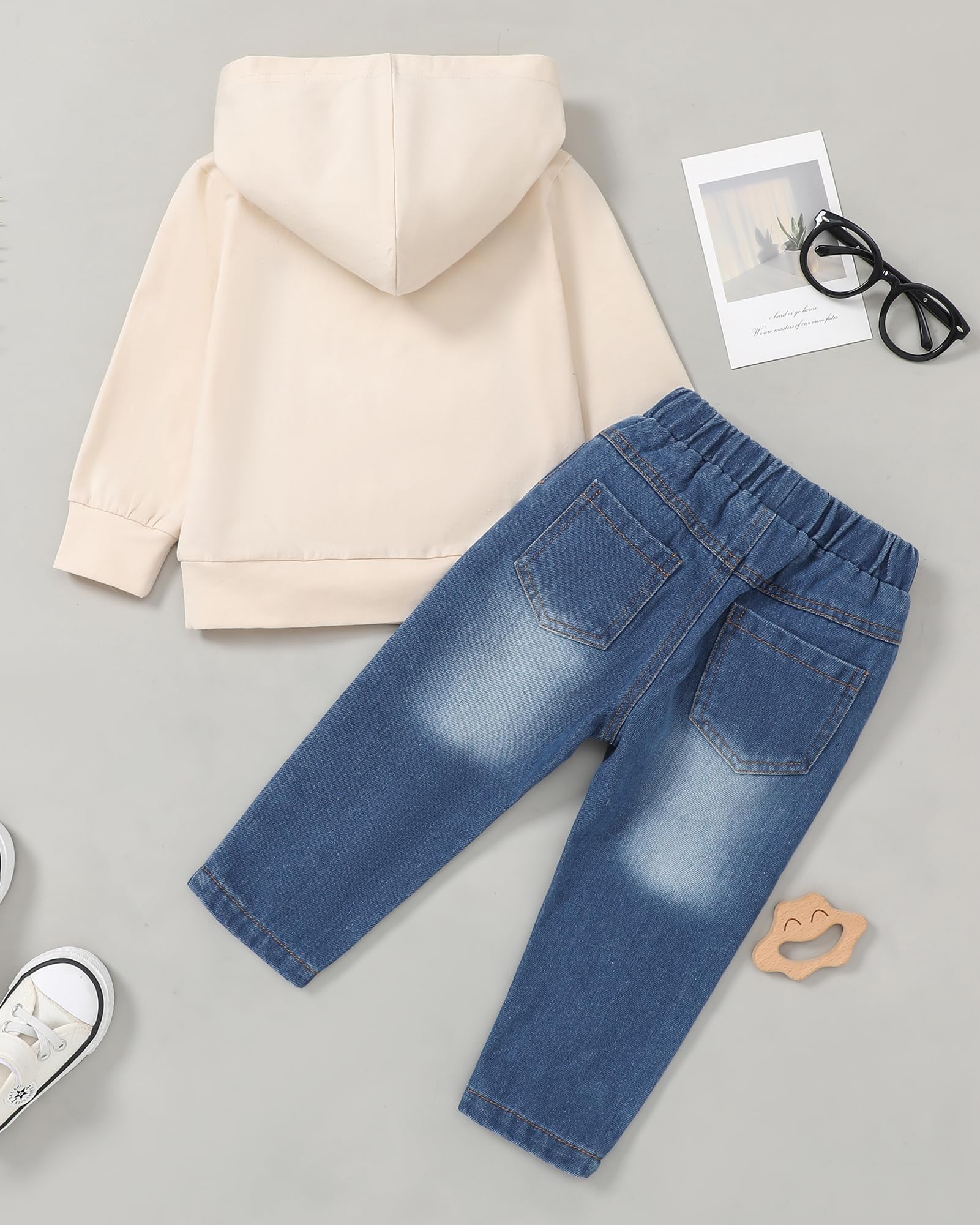 Stylish baby boy outfits: Pullover design, letter pattern printed long sleeve hoodie top and ripped jeans pants. Build your little guy a trendy look now!
