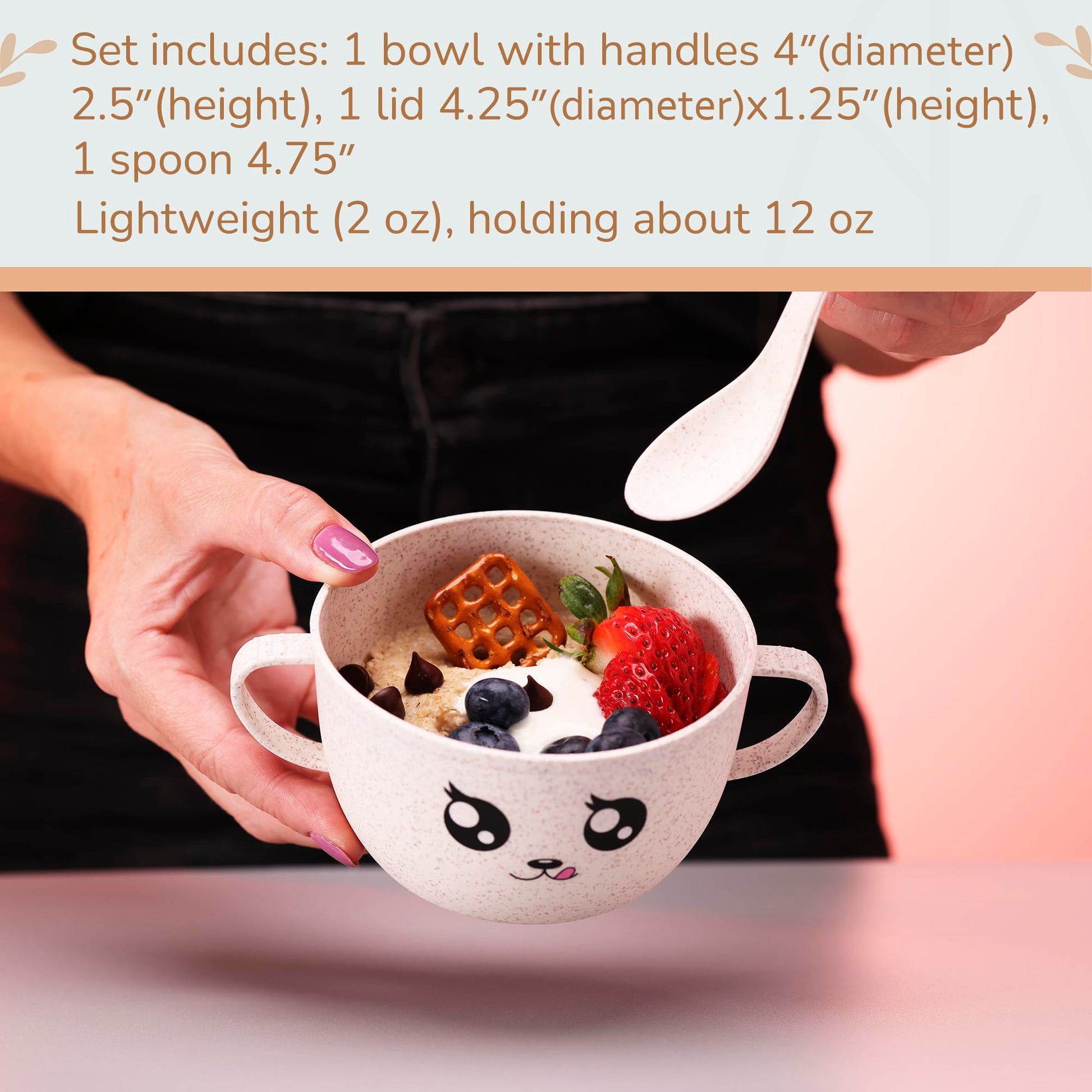 - CONVENIENT LID & SPOON INCLUDED: With a handy lid and spoon included, our wheat straw bowl provides a complete set, making it perfect for snacks, cereals, and even meals on the go. Set includes: 1 bowl with handles 4x2.5”, 1 lid 4.25x1.25”, 1 spoon 4.75”