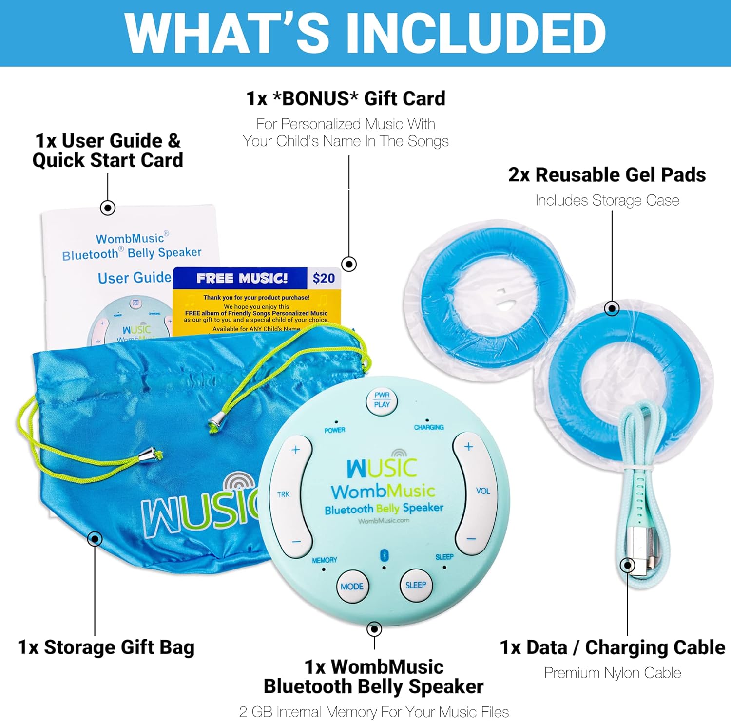 - AWARDED PATENT (US D990,452) for our Innovative Wireless Belly Speaker includes everything you need to play music, share stories, and help your baby bond with loved ones far away. Includes Bluetooth belly speaker, 2GB Internal Memory for your library of songs, built-in headphone jacks (no splitter required), USB data/charging cable, 2 silicone reusable gel pads with a case, premium silk storage bag, user guide, and free $20 bonus gift of music. Safe Expecting Mom Gift for Prenatal Bonding!