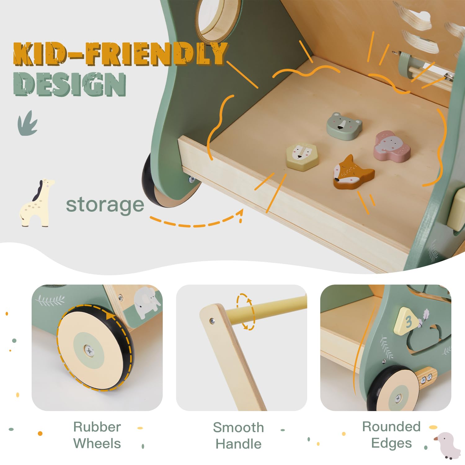 Wooden Baby Walker, Baby Push Walker for Girls and Boys, Montessori Toy, Learning to Walk with Activity Center, Push and Pull Toys with Wheel Adjustable Speed