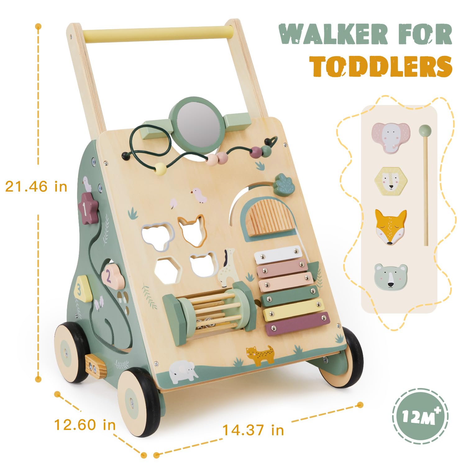 - Multifunction Baby Walker: Our baby push walker is equipped with a vibrant interactive panel, xylophone, rolling drum, mirror, beads game, spinning gears, shapes sorter, and a variety of learning toys.