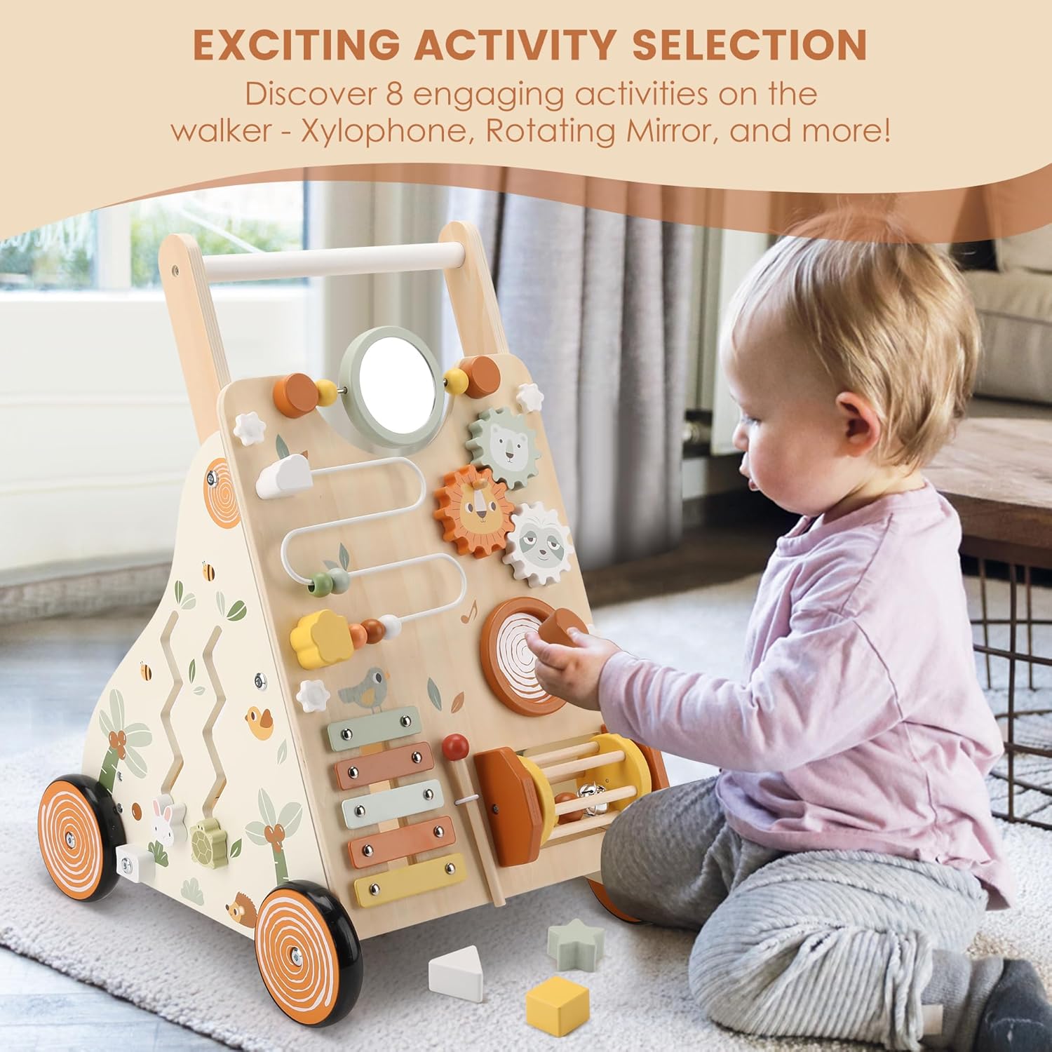 - ALL-IN-ONE LEARNING AID: Meet our Wooden Baby Walker, a multifunctional tool supporting toddlers' first steps while fostering curiosity and skill development.