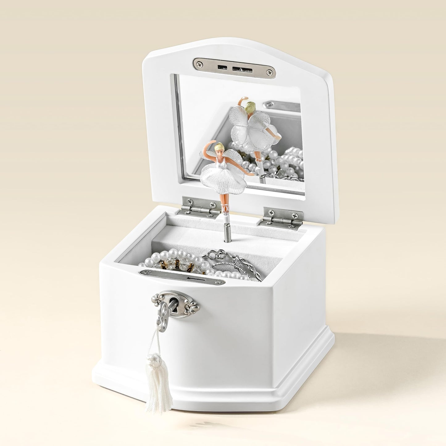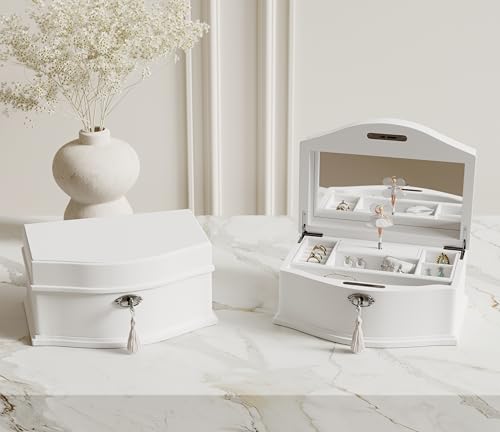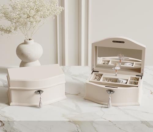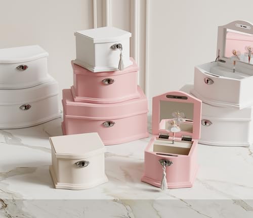 Wooden Musical Jewelry Box for girls with Mirror and Key Lock, Gift for Kids on Birthdays and Holidays (Pink, Small) (Beige, Small)