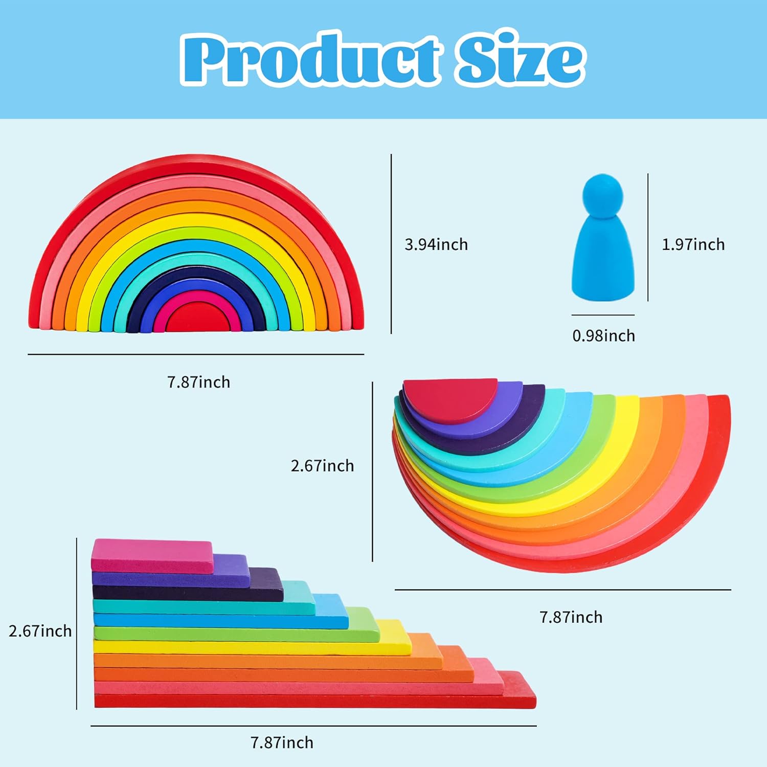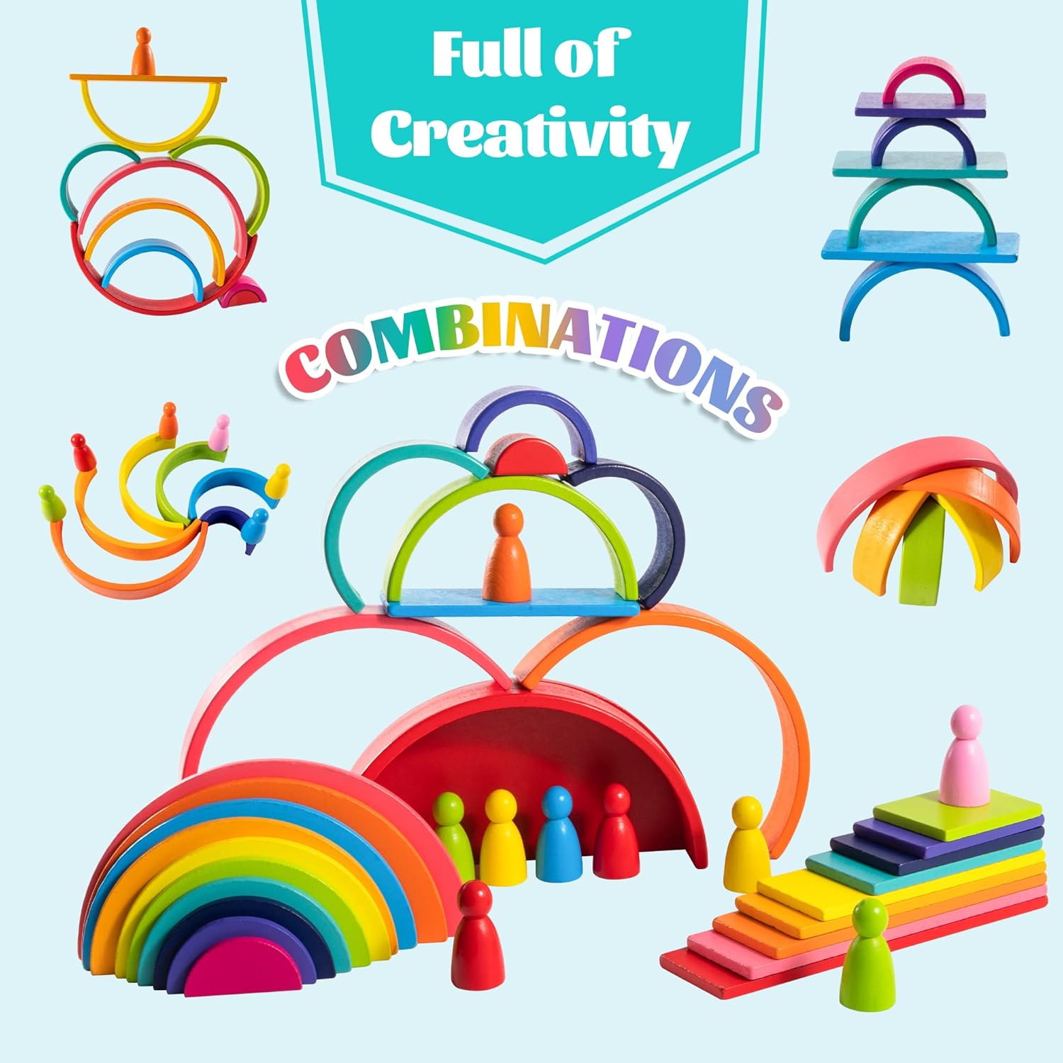- 4 in 1 Nesting Stacking Toys: Rainbow Stacker Playset includes 4 shapes of wooden rainbow in 11 colors: 12 arch bridge, 11 semicircle blocks, 11 rectangle blocks and 11 peg dolls. More wooden rainbow blocks provide more possibilities for children. Rainbow blocks can be stack as bridge, tunnel, bike, bed, flower, animal and so on.