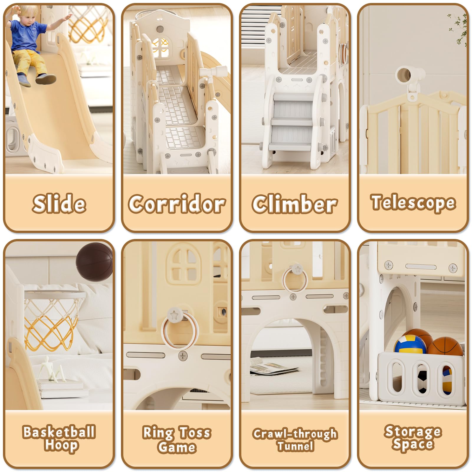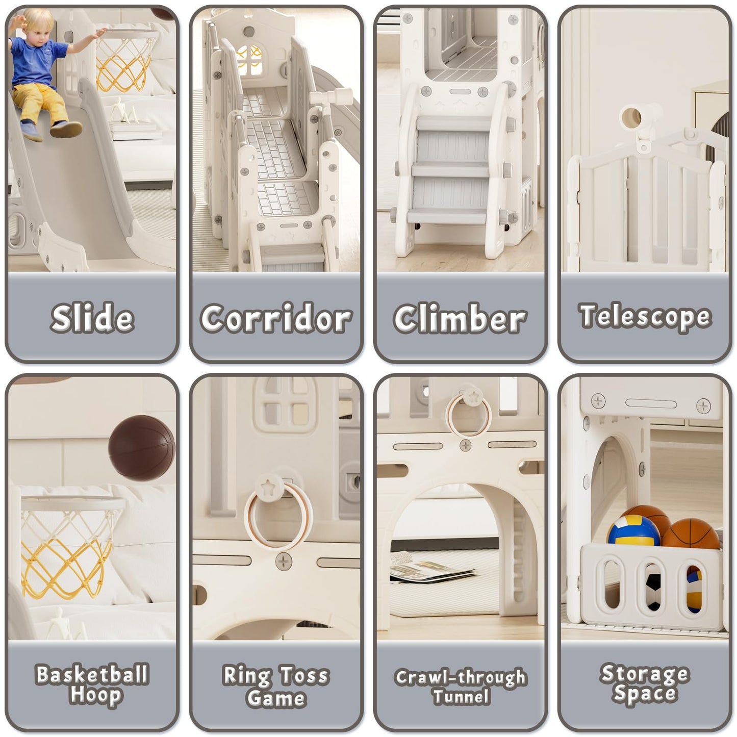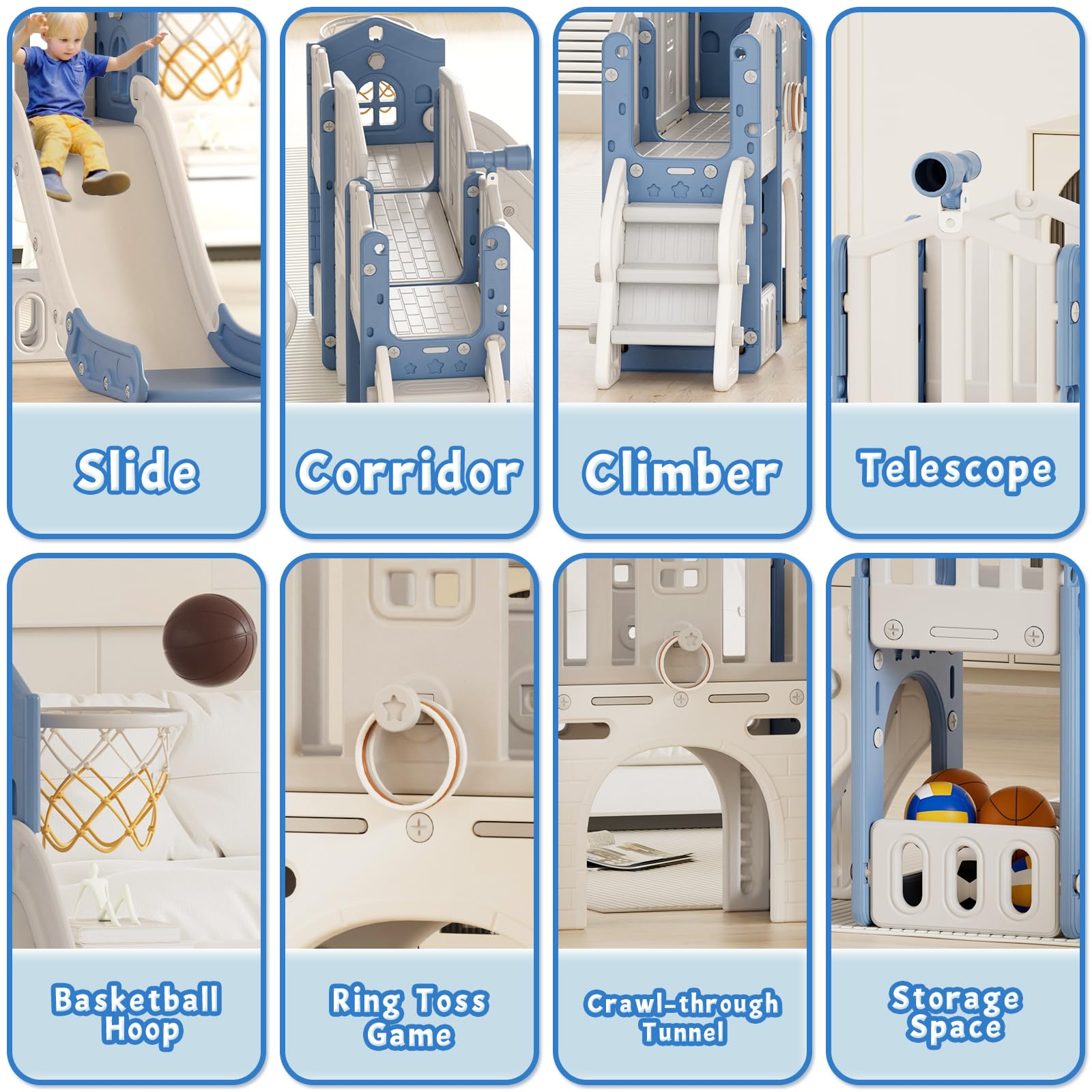 - 9-in-1 Toddler Playground :The toddler slide has 9 activity areas, including stairs, slides, 2 storage spaces, ring-toss game,basketball area, aisle, game board,play telescope and climbing area at the bottom
