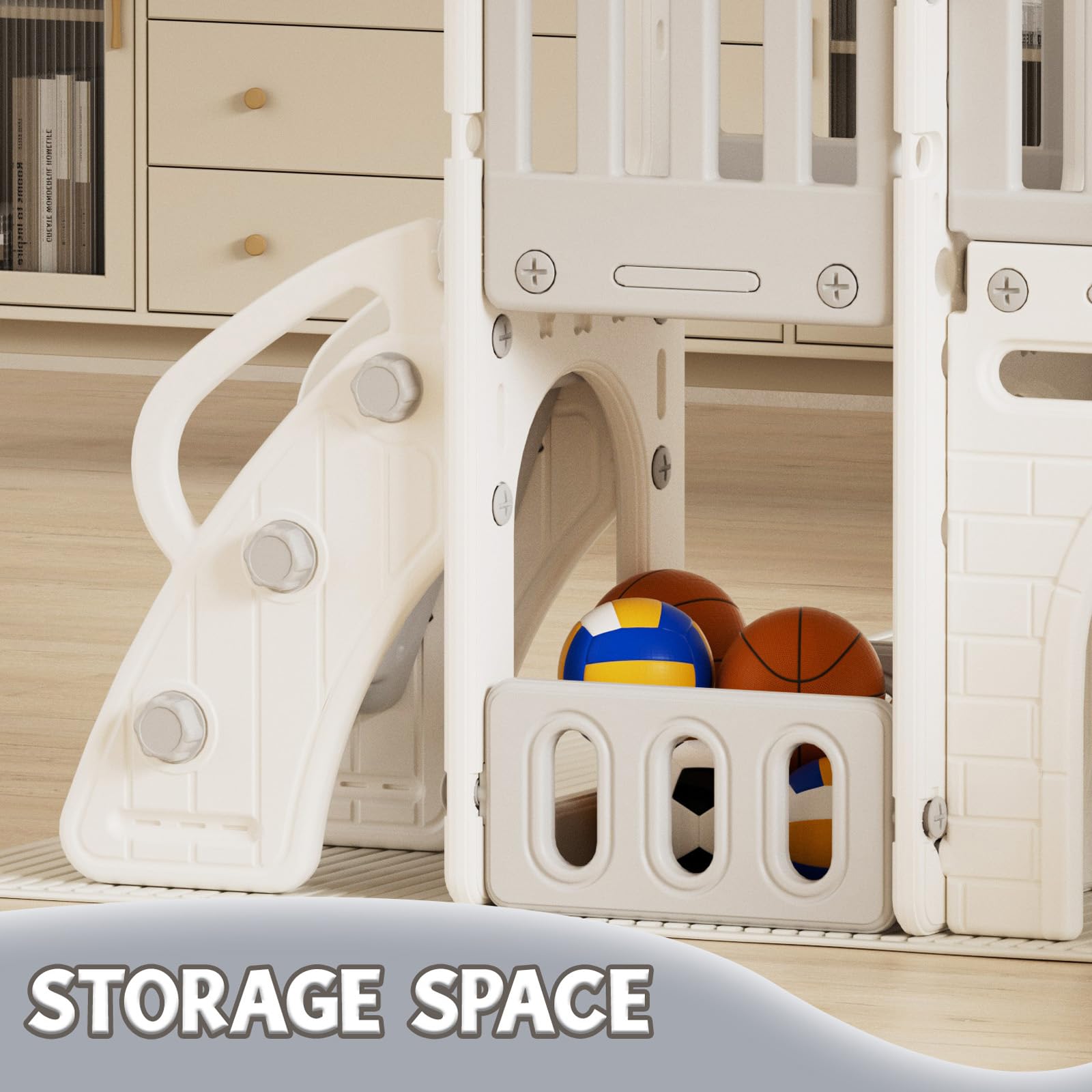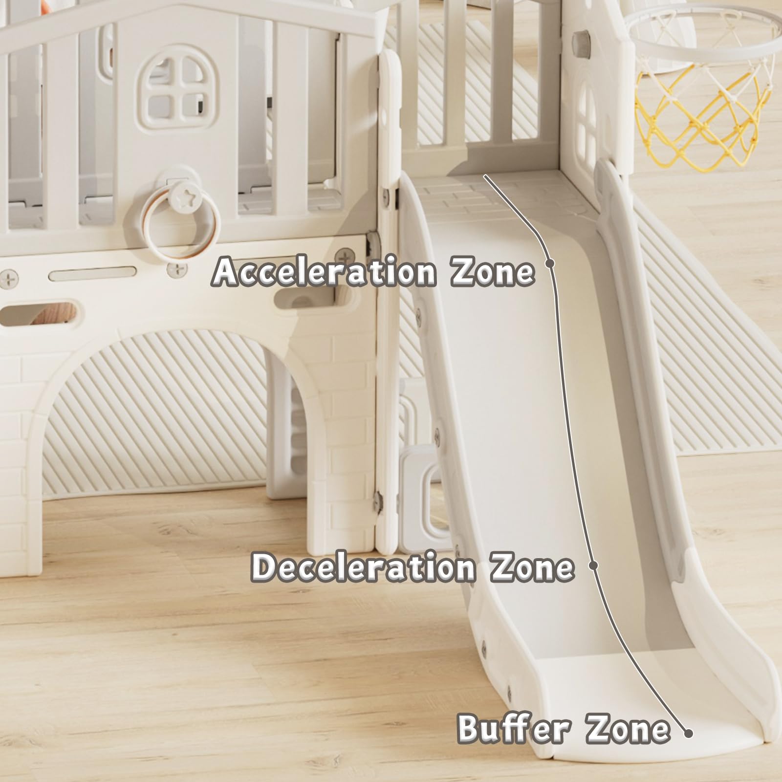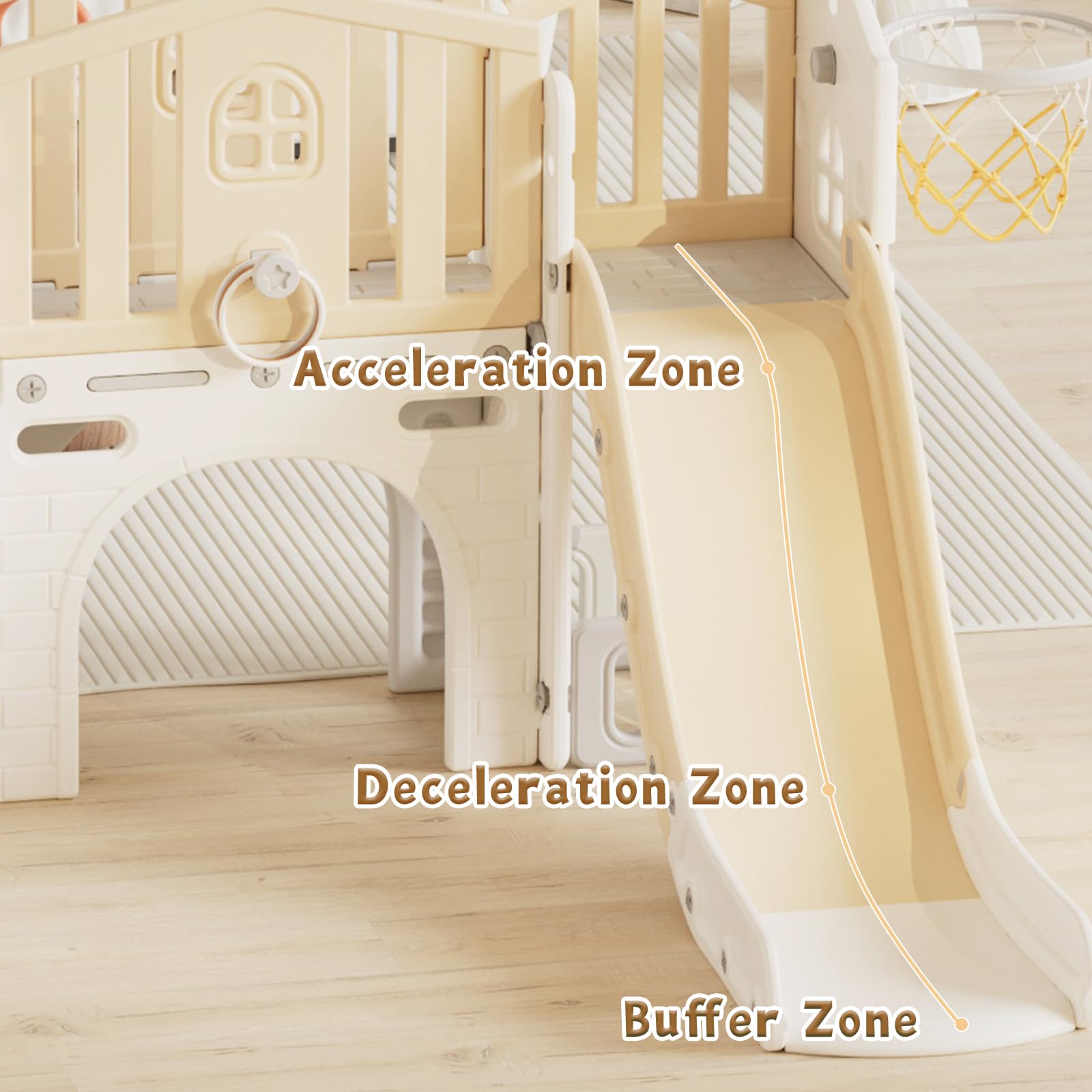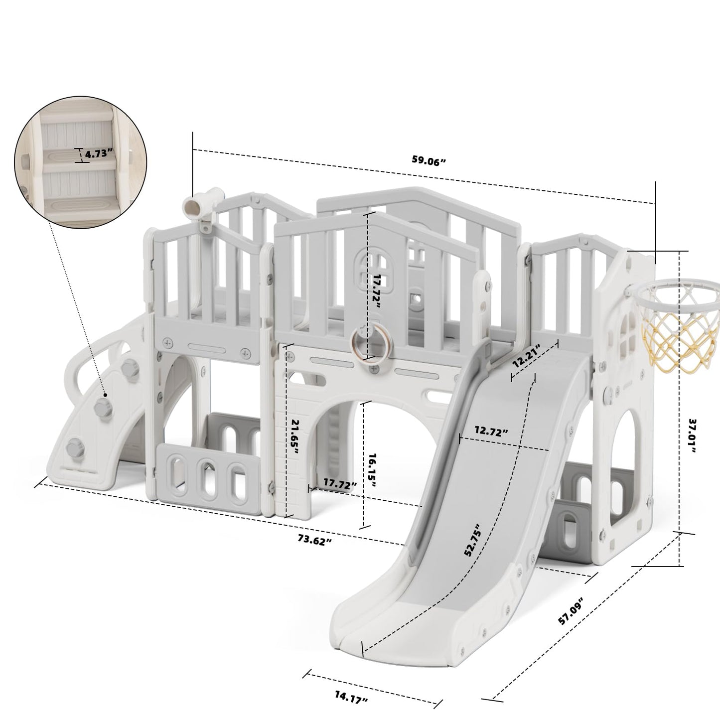 - 9-in-1 Toddler Playground :The toddler slide has 9 activity areas, including stairs, slides, 2 storage spaces, ring-toss game,basketball area, aisle, game board,play telescope and climbing area at the bottom