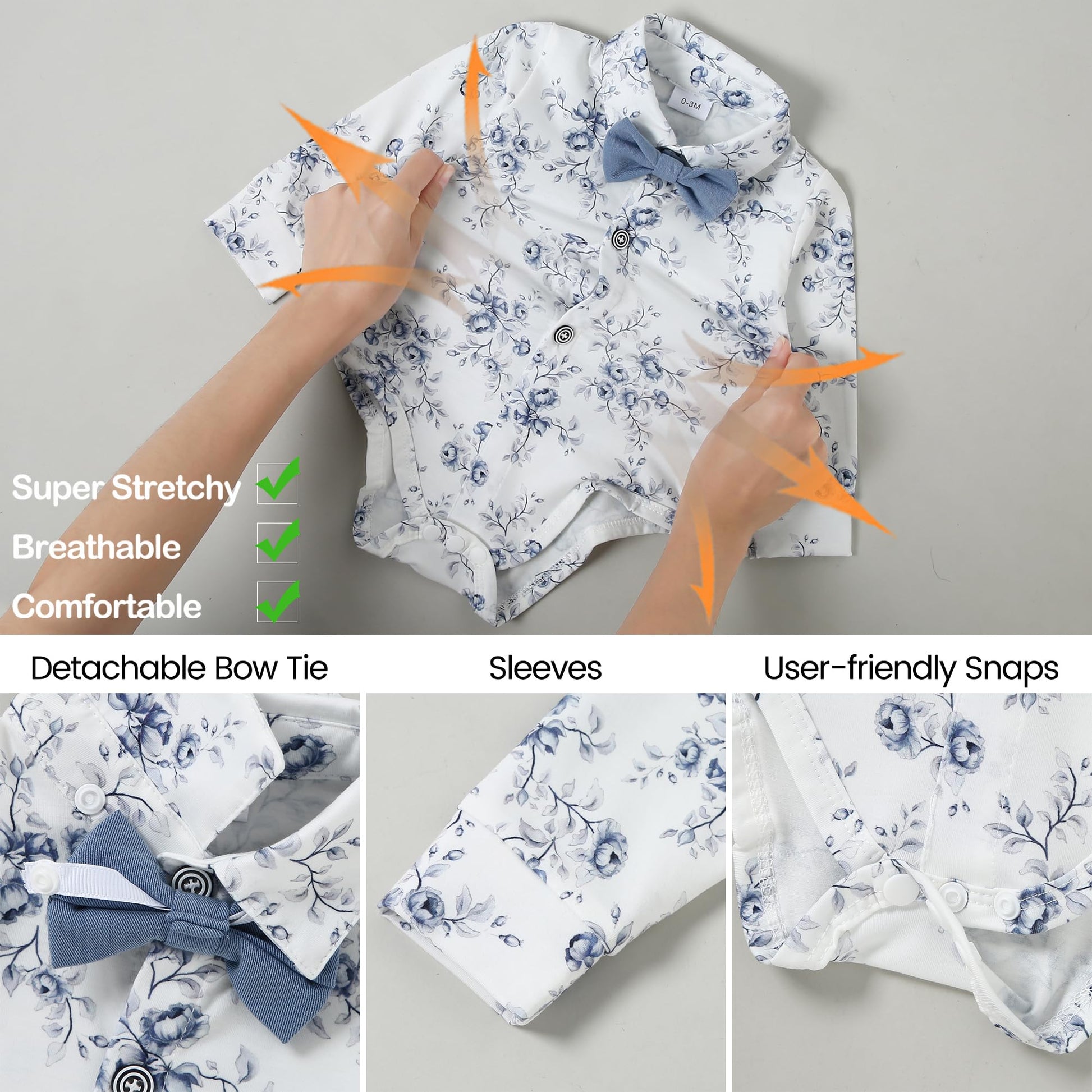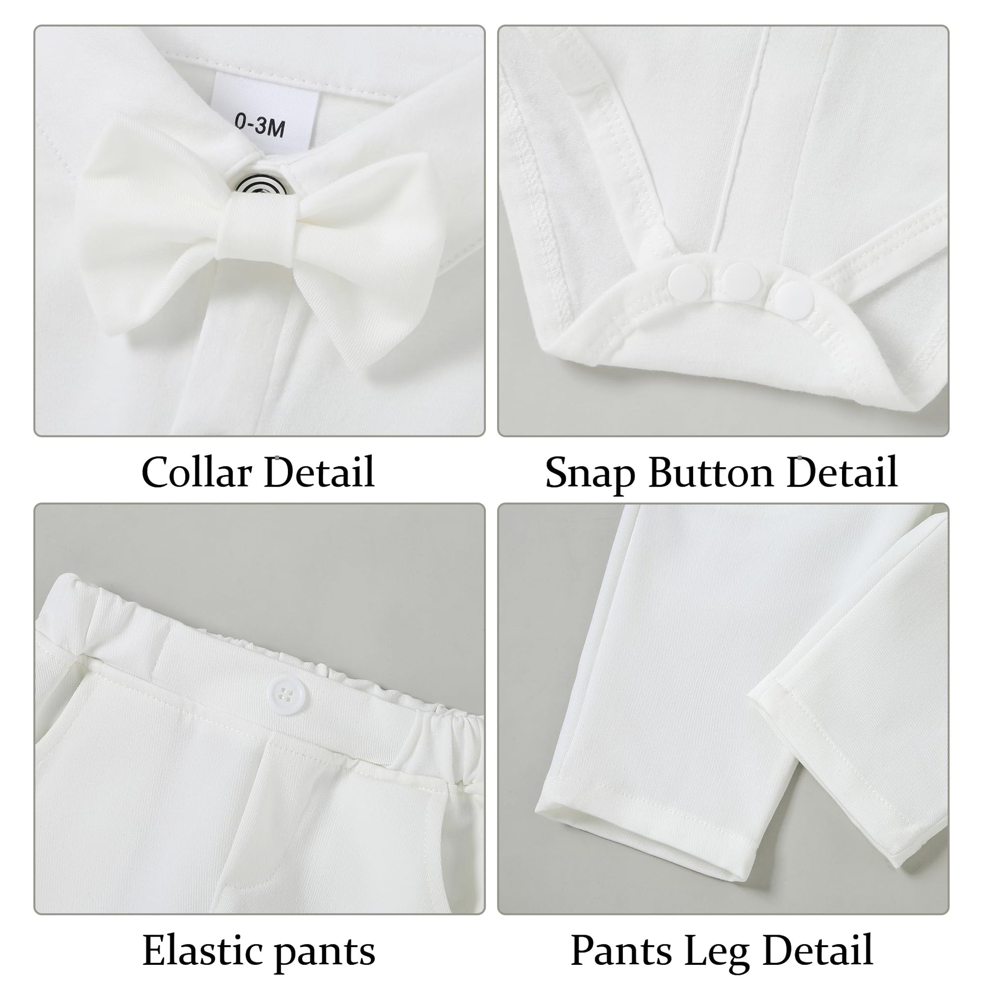 High Quality Material: Baby boy outfits are crafted from a premium cotton blend material that offers exceptional softness, breathability, skin-friendly and and comfortable. The top with removable bow and buttons at the bottom of the shirt for easy diaper changes, practical and convenient.