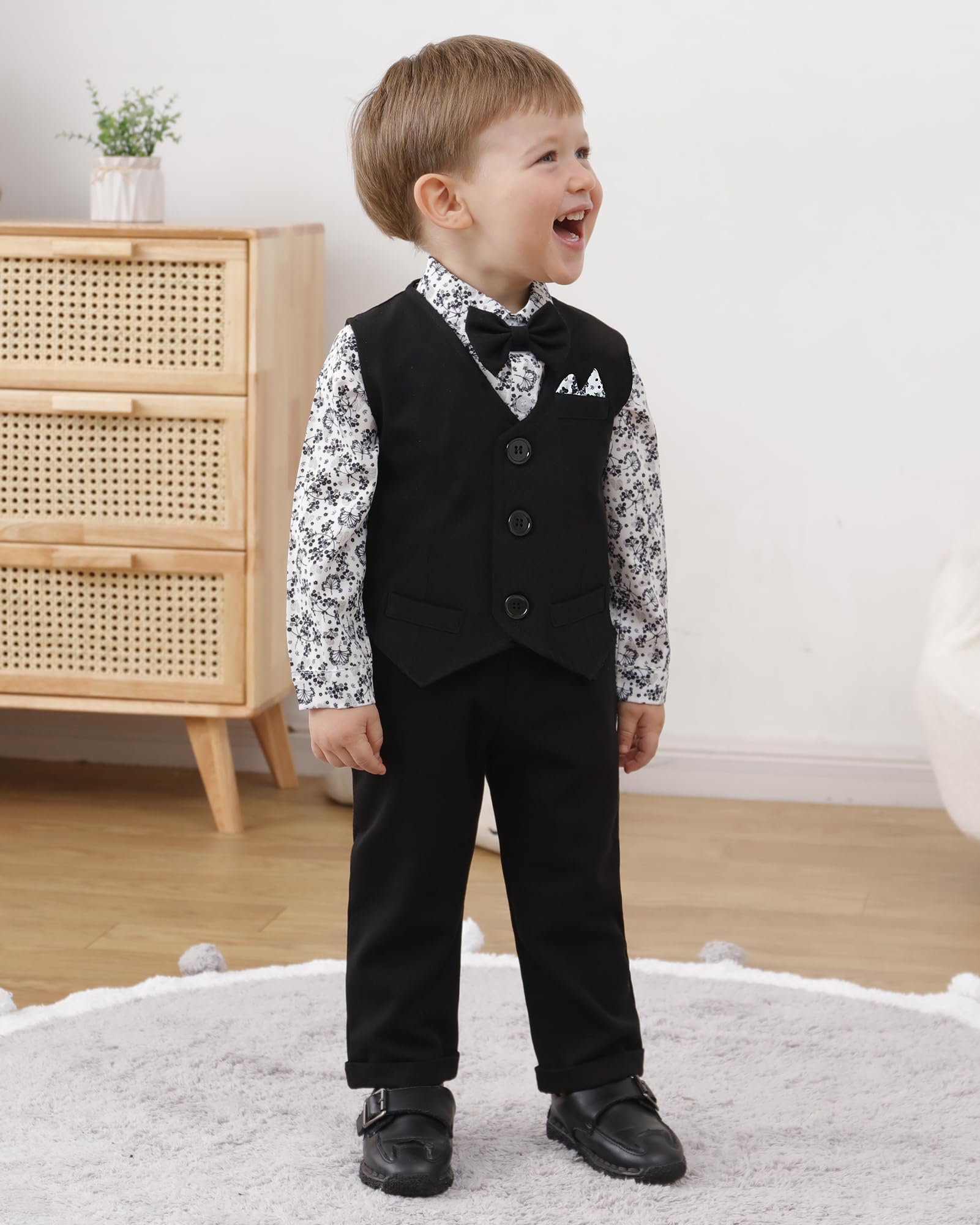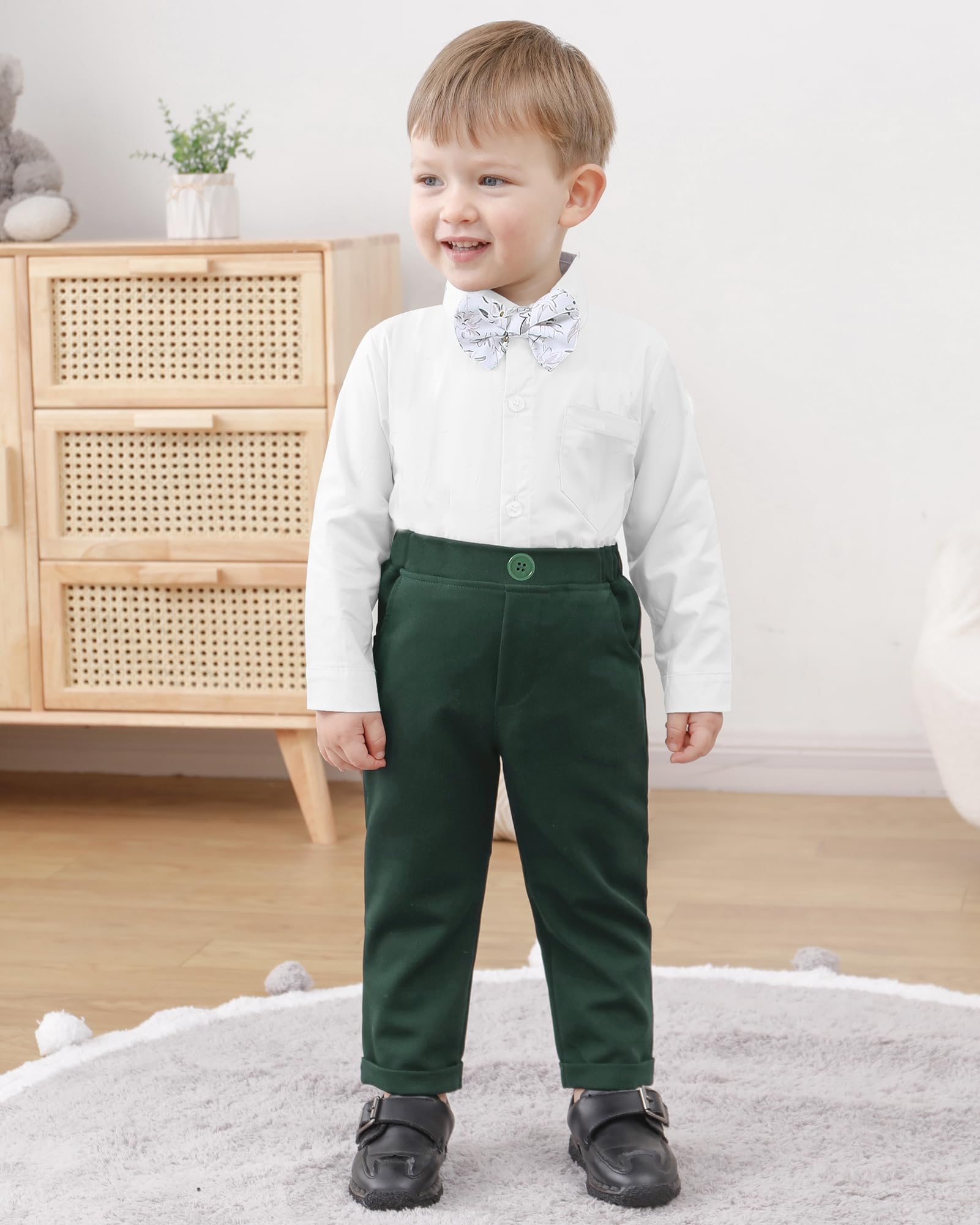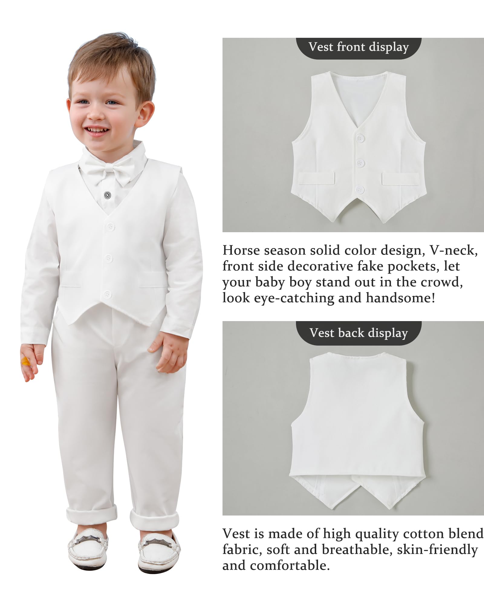 - √Package Include: 1x Dress shirt with bow-tie + 1x Vest + 1x Pants. Provide the most comfortable and fashionable wearing experience for your baby boy in daily or holiday, such as Easter Halloween Thanksgiving Christmas.