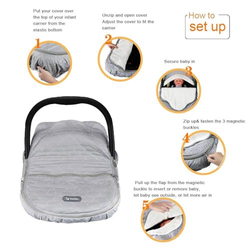- Patent Design: Easy to secure baby in the car seat carrier without take off the carseat cover, you can unzip the flap or roll the top at side to adapt temperature change.Our winter carseat cover meets safety standards and approved by CPSC certifications.