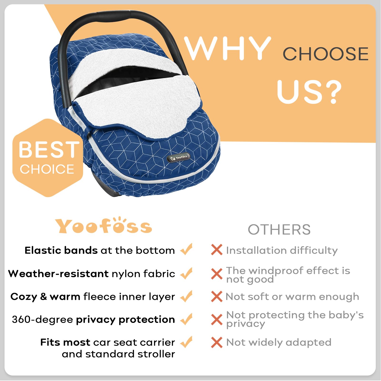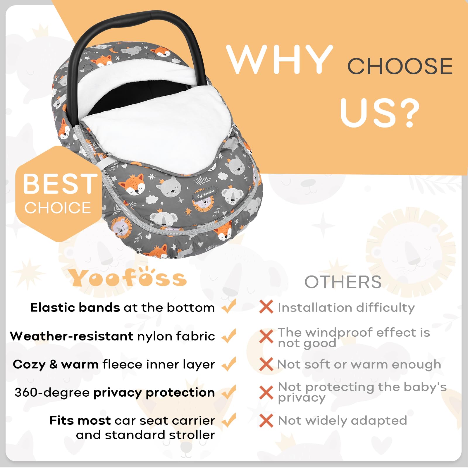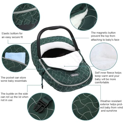 - Winter Car Seat Cover for Babies: Weather-resistant nylon blocks wind and rain. Soft fleece cover keep out the cold, way more convenient than keep a blanket on and more comfortable than using a coat or snowsuit.