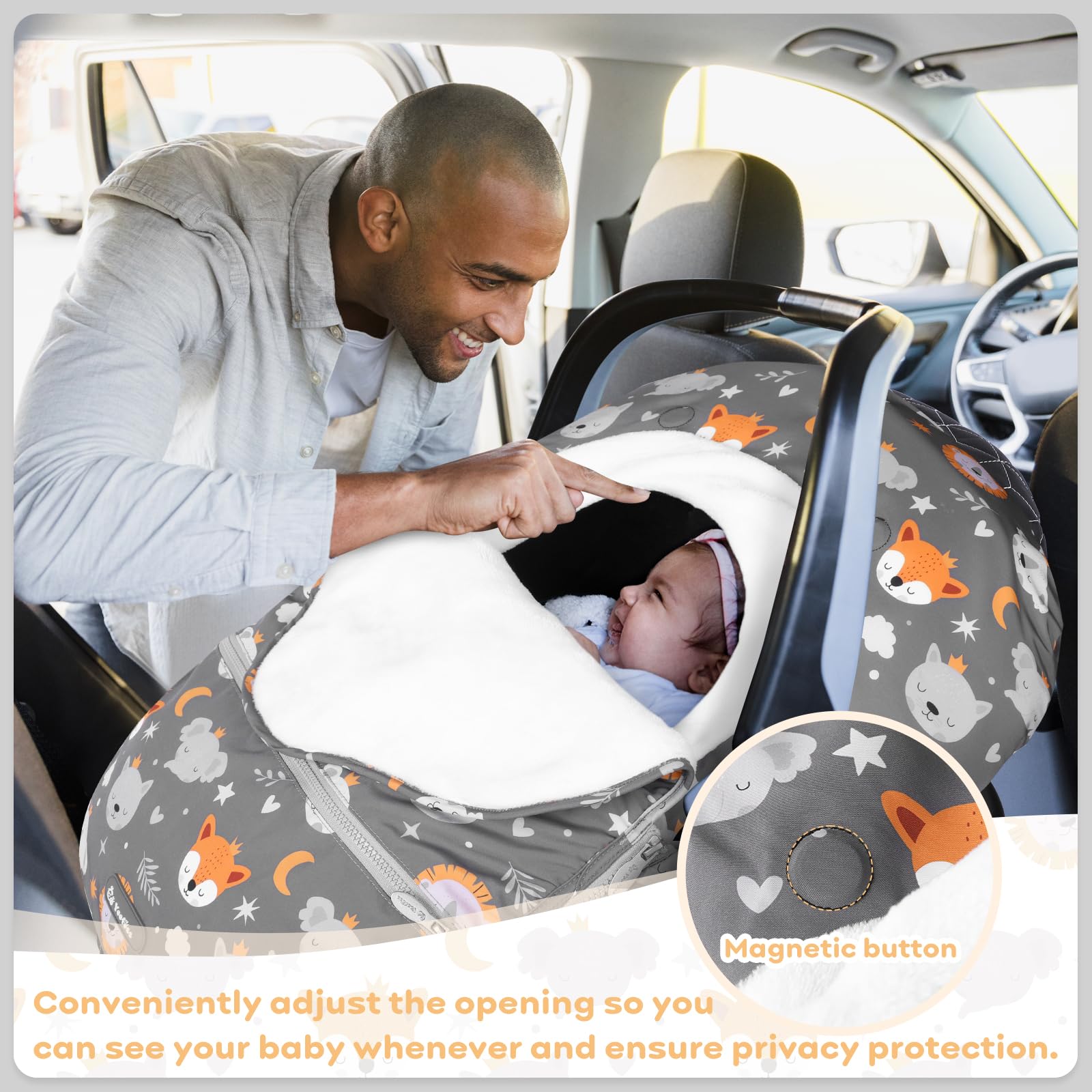 - Ultility and Stylish: The three magnetic buttons on the flap of the winter car seat cover for baby can adjust the opening to see your baby whenever,insure the privacy protection and adjust the temperature without removing the car seat cover for babies.