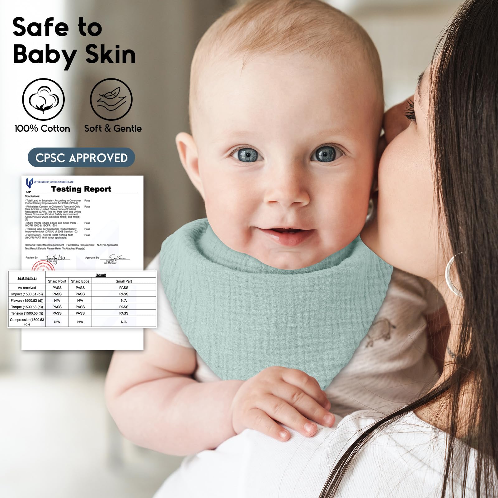 - Skin-friendly and Safe: Yoofoss muslin bibs have been approved by CPSC certifiation. The muslin yarn provides the softness and comfort. It is as safe for babies especially for sensitive skin. Suitable for infants, toddlers, heavy drooling and teething babies.