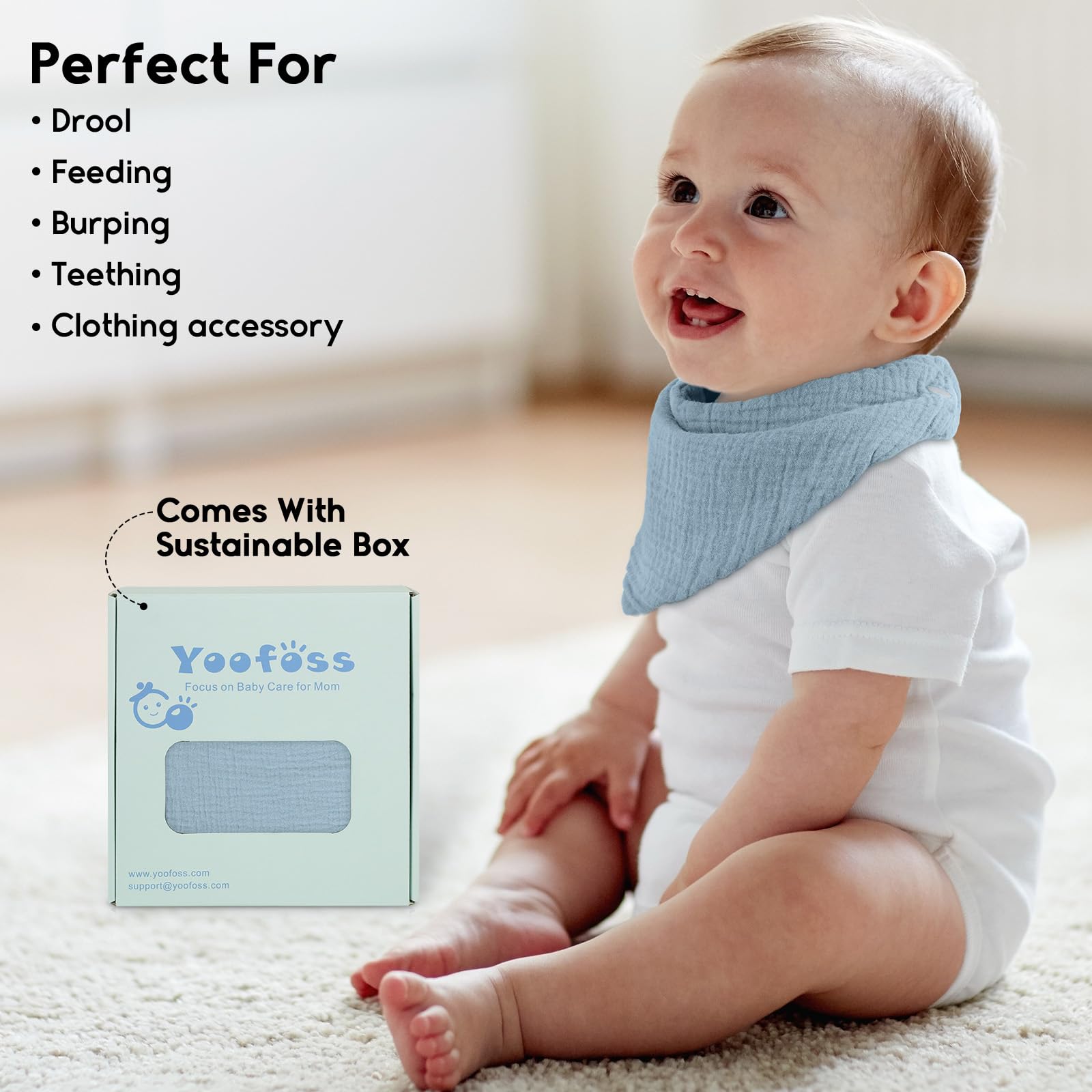 - EXCELLENT GIFT SET: The 10 pack muslin baby bibs are exclusively designed by Yoofoss to ensure that your baby never runs out of styling options.A variety of colors to perfectly match any daily outfit for baby boys & Grils. The exquisite package is suitable for baby shower gifts and registry.