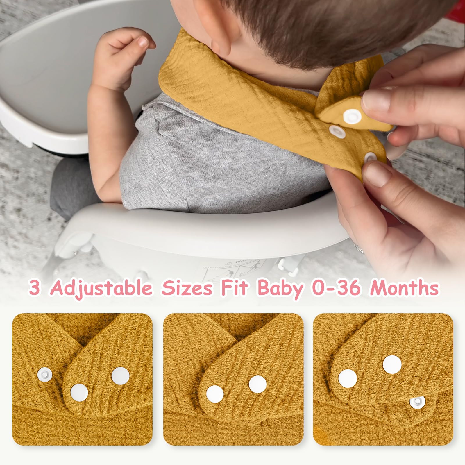 - Adjustable Size: Each baby muslin bibs comes with 2 pairs of nickel-free snaps, easily adjust the size of the bib, can adjust it according to your baby's growing needs, suitable for babies 0-36 months. Both hand and machine washable for make it easy care.