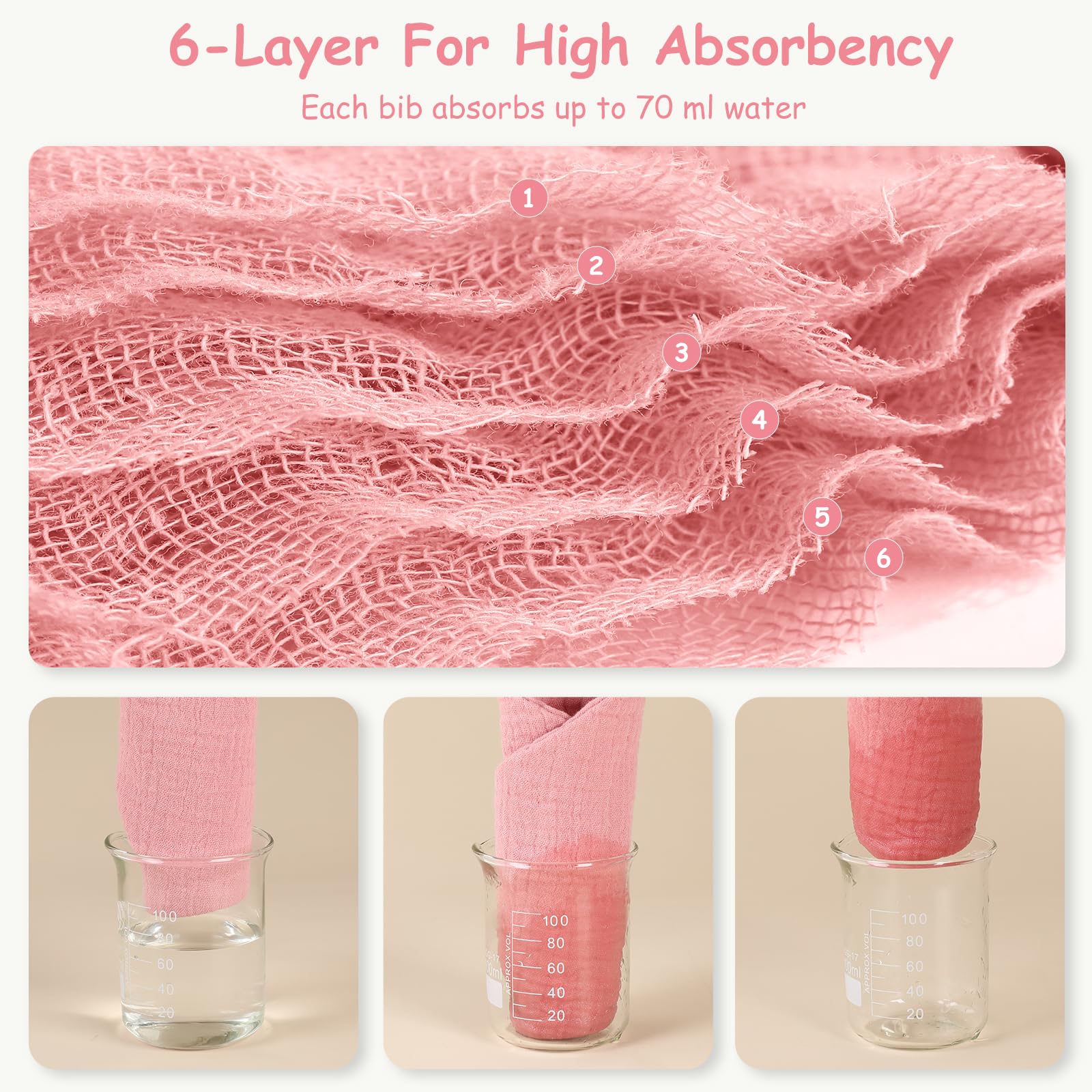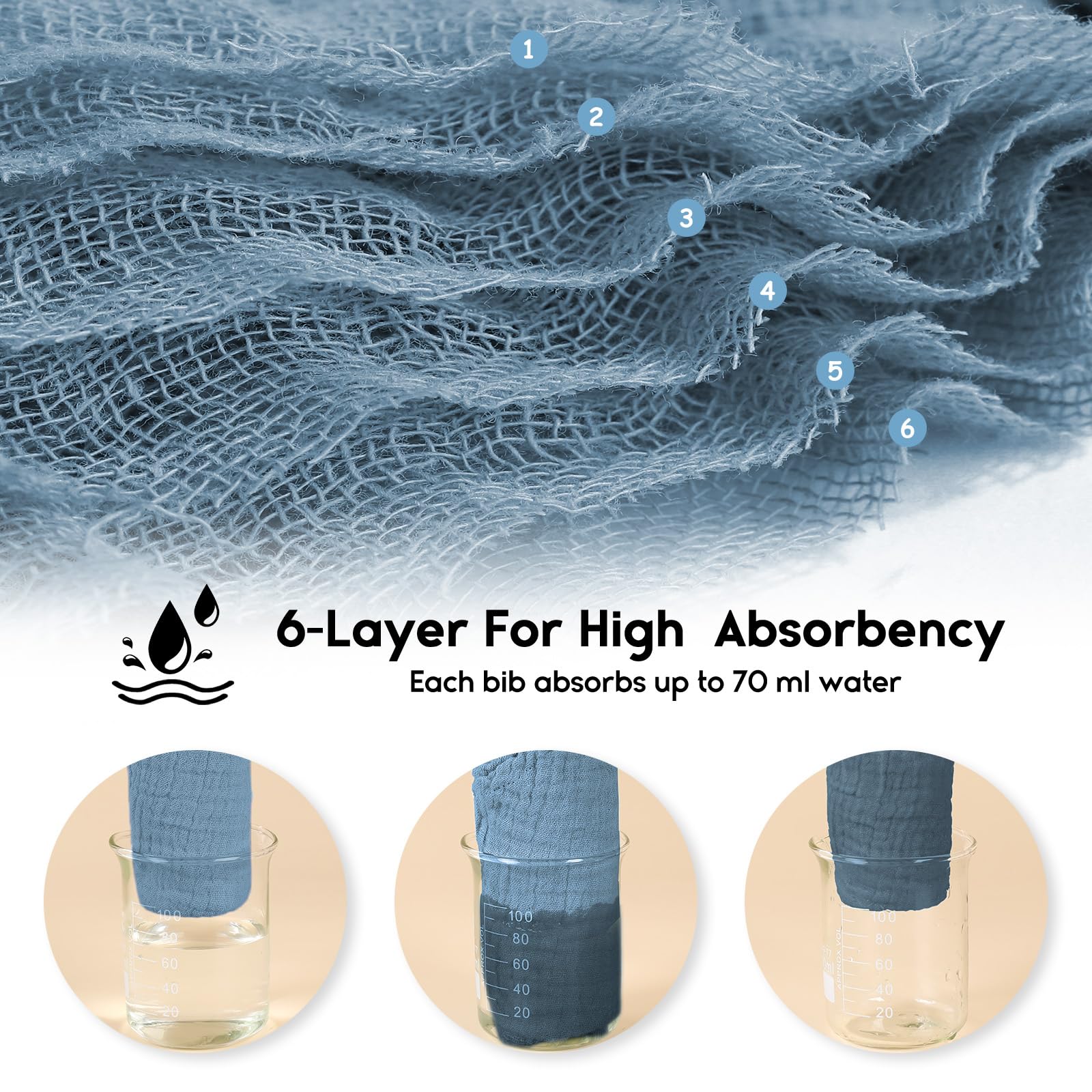 - Super Absorbent : 6 layers of thickened muslin bibs have super absorbency. Each muslin baby bibs can absorb 70ML of clean water. Even if your baby is a heavy drooler, it can be completely absorbed by these bibs, keeping your baby's clothes dry all day long.