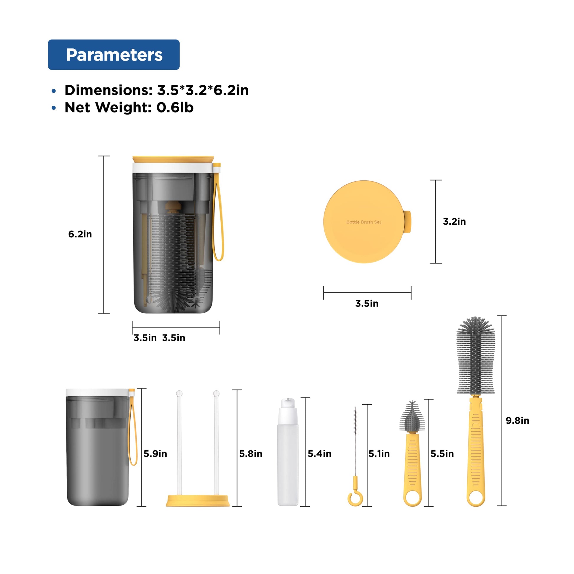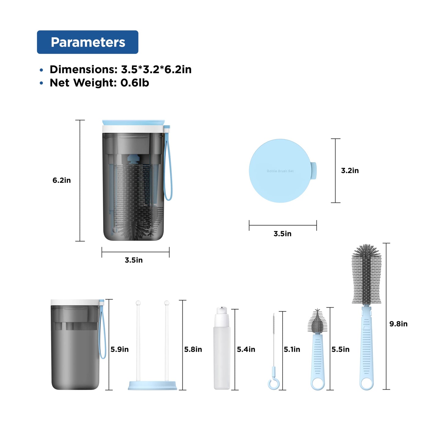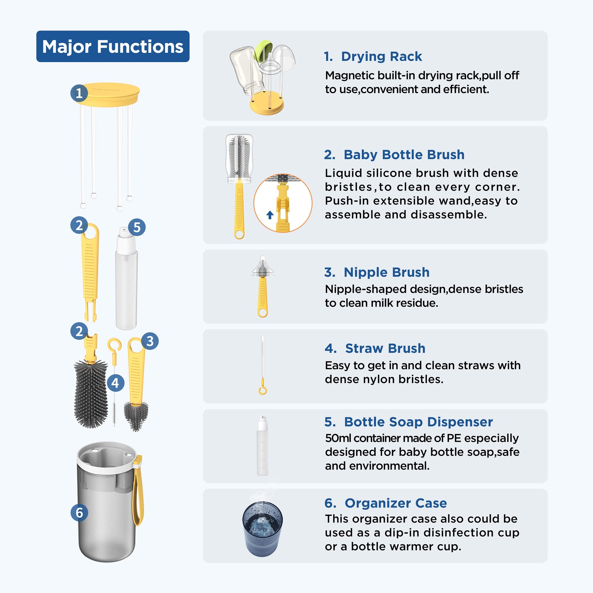 - ✈【On The Go Baby Bottle Brush Set】This baby bottle brush travel kit has a 6 in 1 design which features a 9.8" baby bottle brush with an extendable wand, a 5.5" nipple brush, a 5.1"straw brush, a 5.9"baby bottle drying rack, a 1.7oz baby bottle soap dispenser and a container case. This liquid silicone brush set is more hygienic than easy-to-mold and hard-to-dry sponge brushes. Durable silicone bristles are scratch-free yet soft.