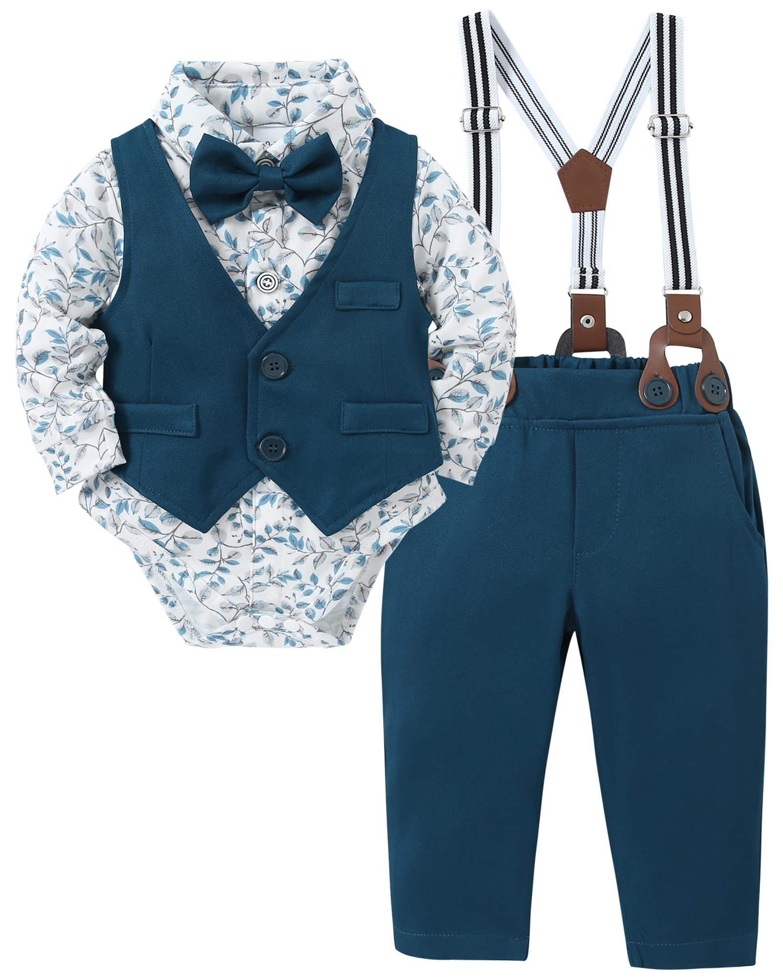 MATERIAL: The baby boy suits is made of High quality cotton blend fabric , soft, breathable and skin friendly. The top with removable bowtie and buttons at the bottom of the shirt for easy diaper changes, practical and convenient. DESIGN INSPIRATION: A dashing baby boy outfits ensemble featuring classic and innovative color combinations to add depth. The vest boasts a V-neck and faux pocket design, ensuring your little one stands out in the crowd, radiating a handsome and eye-catching charm. OCCASIONS: This suits for baby boys are perfect for both formal and casual occasions, such as weddings, baptisms, gatherings, birthdays, church events, parties, or everyday wear. It also makes a great gift for boys, making your little one look handsome and gentlemanly, becoming the center of attention wherever he goes. RECOMMENDED AGE: Suitable for 0-3 months newborn boy clothes, 3-6 months baby boy clothes, 6-12 month boy clothes, toddler baby boy clothes 12-18 months, Please refer to our size chart to find the most suitable size for your baby boys. THE PACKAGE INCLUDES: 1*dress shirt + 1*bowtie + 1*vest + 1*pair of pants +1*suspenders. Provide your baby with the most comfortable and stylish dressing experience for occasions such as Easter, Thanksgiving, Christmas, first birthday, and everyday wear.