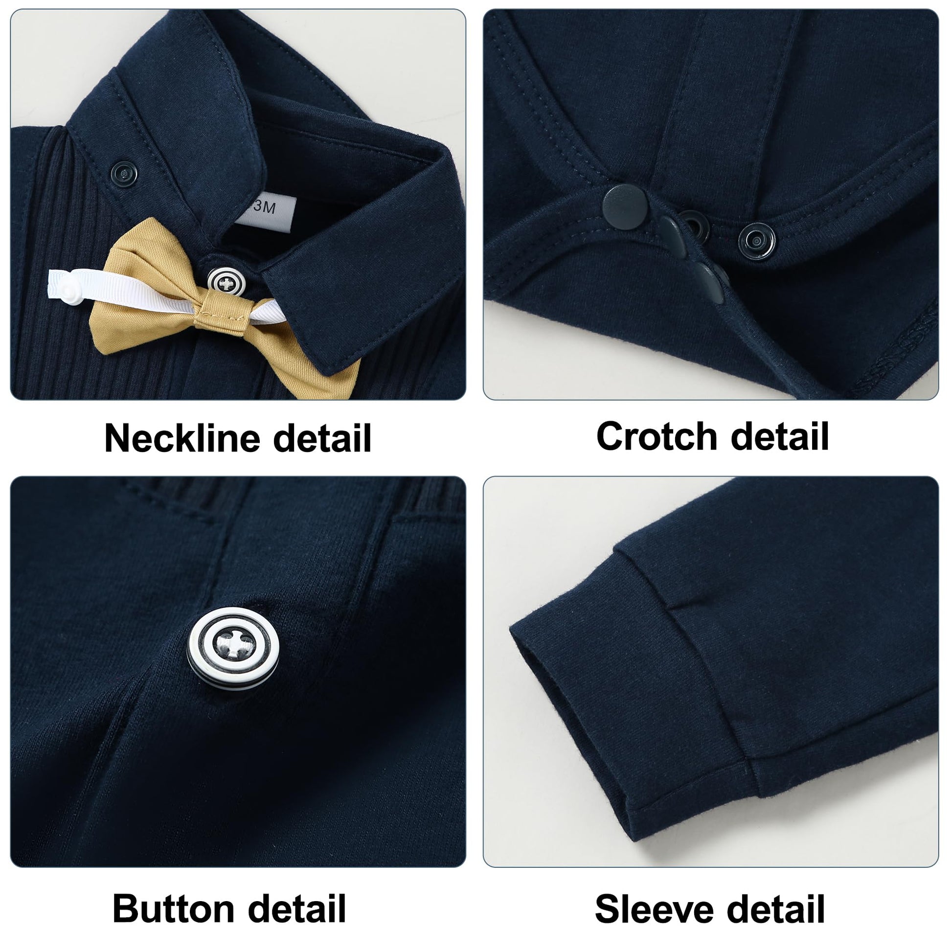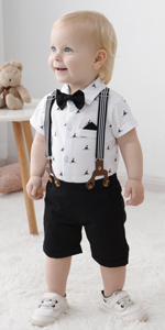 - MATERIAL: The baby boy suits is made of High quality cotton blend fabric , soft, breathable and skin friendly. The top with removable bowtie and buttons at the bottom of the shirt for easy diaper changes, practical and convenient.