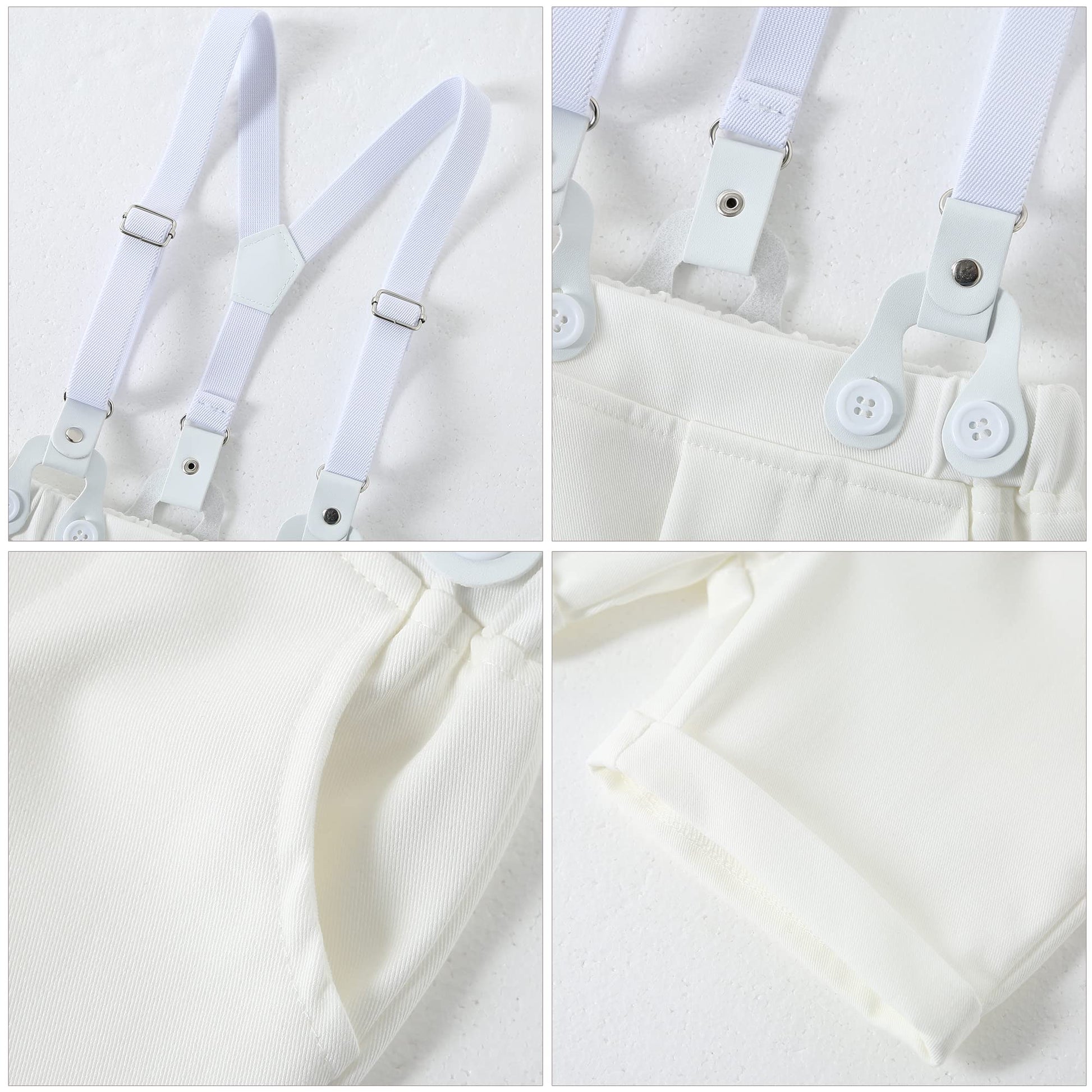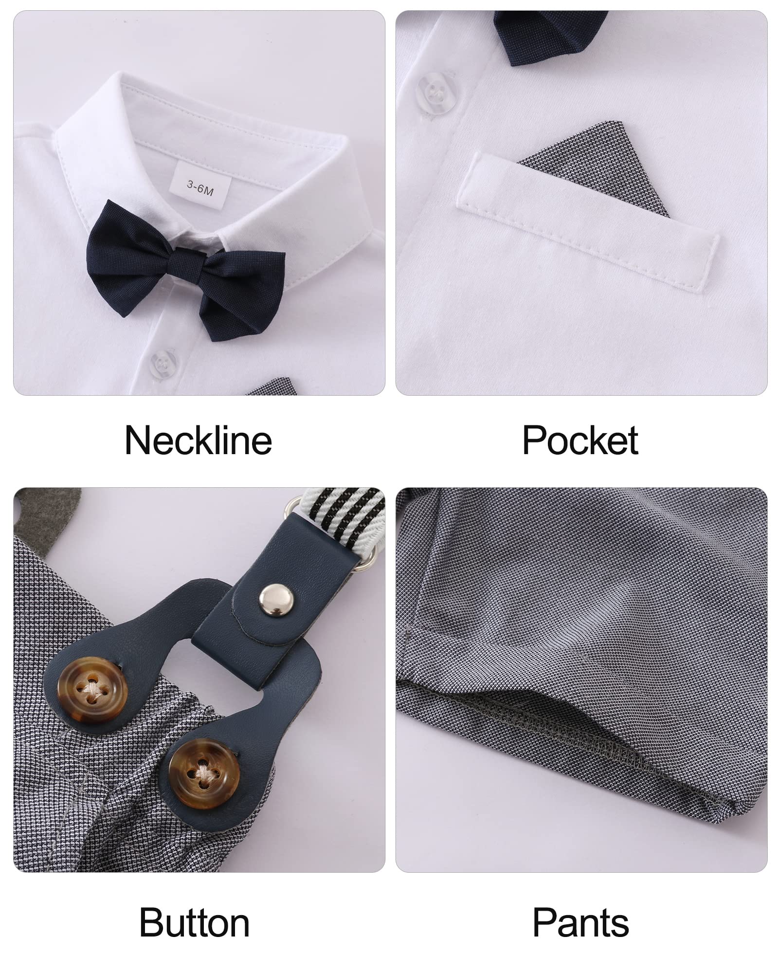 - 【Great Fabrics】: Newborn baby boy gentleman clothes outfits is made of high-quality cotton fabric, which is super soft, lightweight and breathable, better protection to baby's skin. Package: 1 * apricot top, 1 * khaki pant, 1 * bowtie, 1 * suspender.