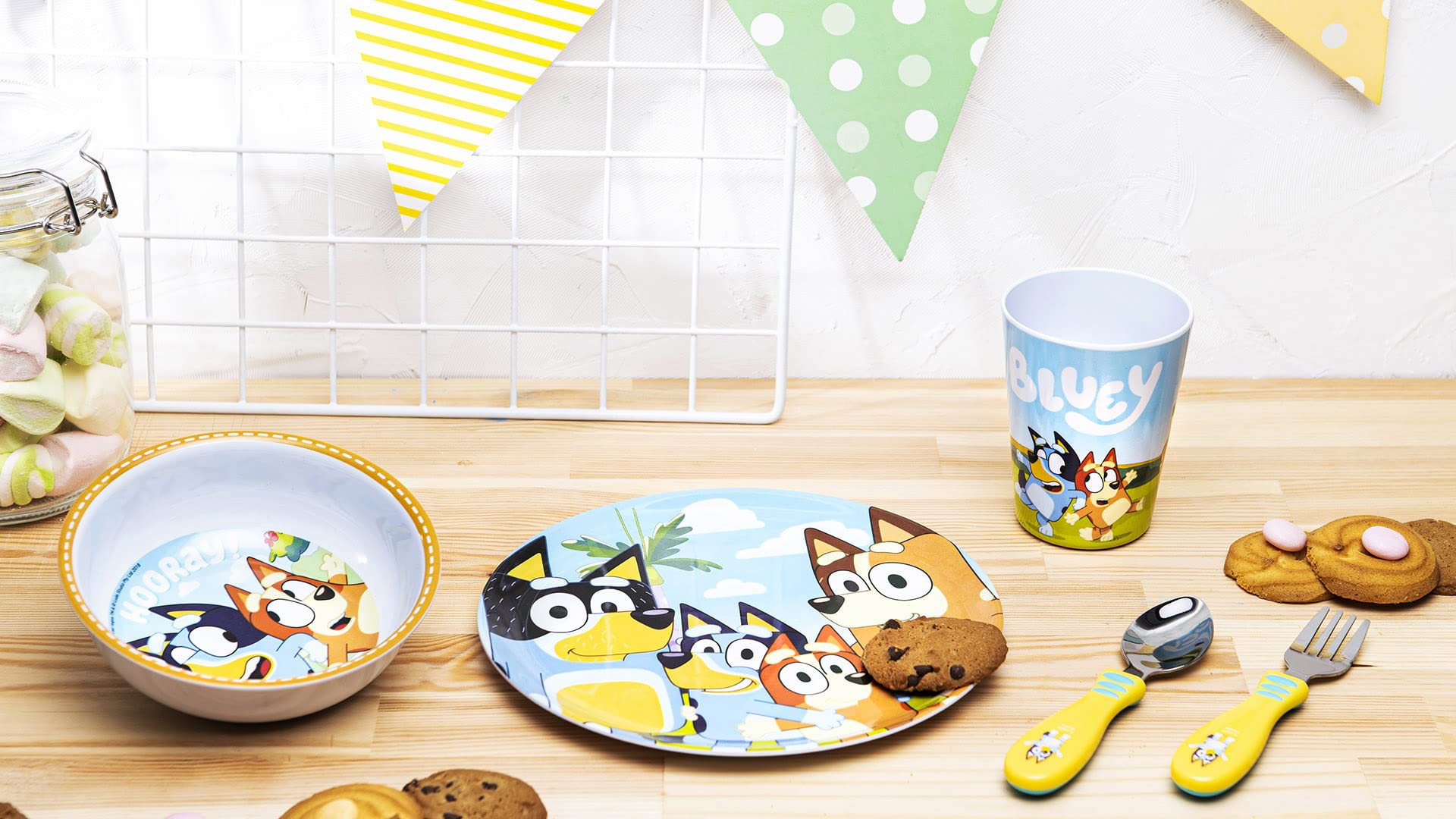 - 5-PIECE DINNERWARE SET - This Baby Shark dinnerware set brings excitement to any meal! It includes a plastic water bottle, an 8-inch round melamine plate, a 6-inch melamine bowl, a fork, and a spoon.