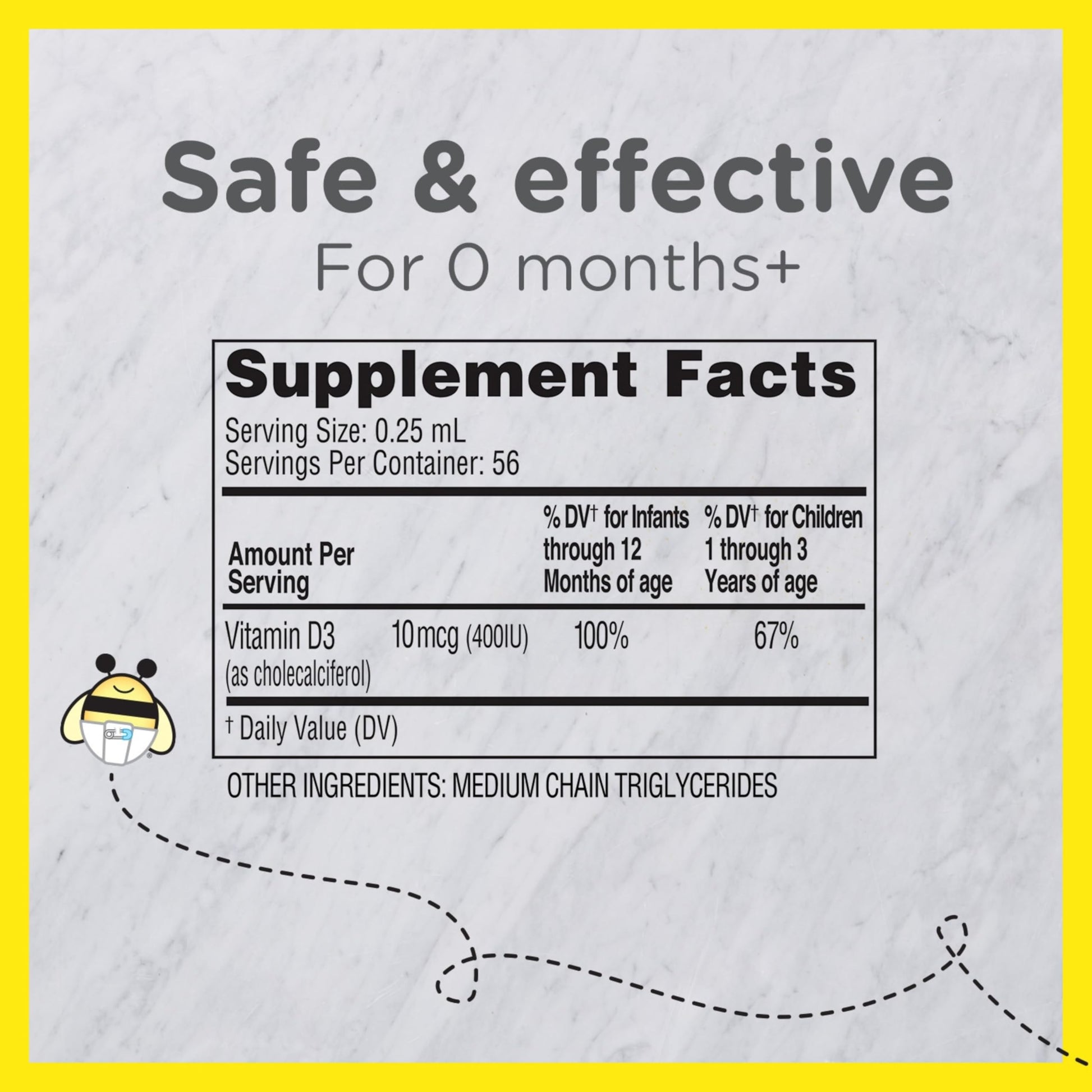 Zarbee's Vitamin D Drops for Infants, 400IU (10mcg) Baby & Toddler Liquid Supplement, Newborn & Up, Dropper Syringe Included, 0.47 Fl Oz