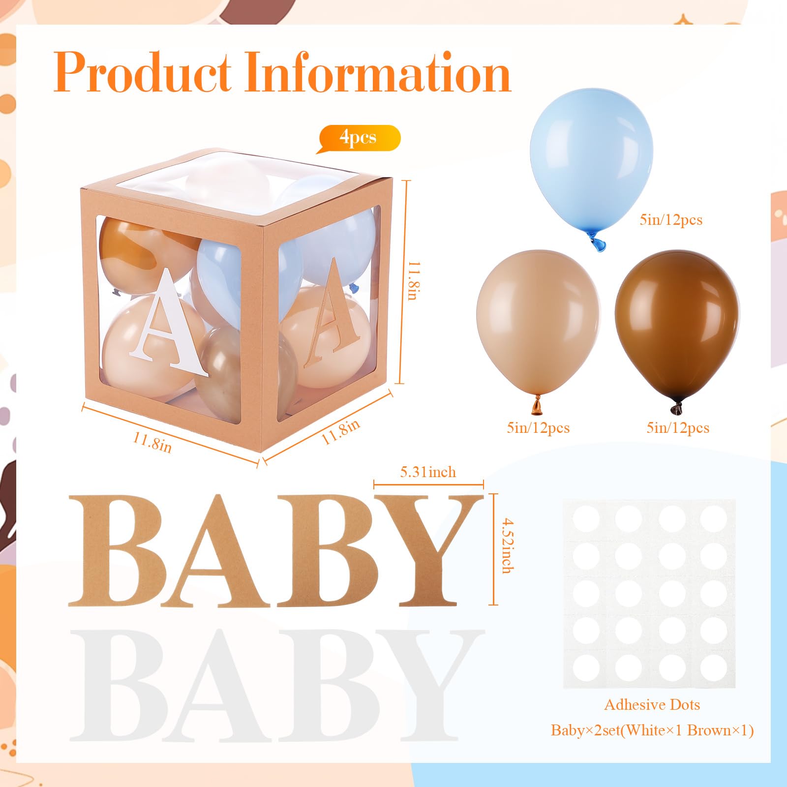 - Abundant Package: the Baby shower party decoration set includes 4 transparent cowhide balloon boxes measuring 12 in x 12 in x 12 in, 4 letters "BABY", and 36 pcs 5 inch balloons, including 12 brown balloons, 12 apricot balloons, and 12 blue balloons; The quantity is sufficient to meet your decoration needs