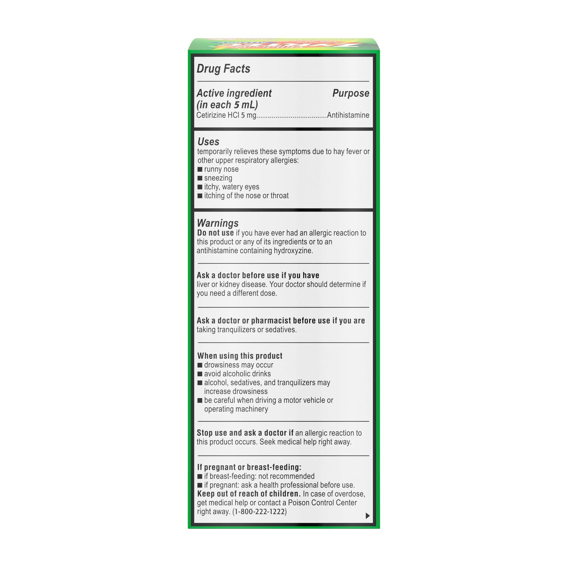 - Zyrtec children's allergy liquid medicine contains 5 milligrams of the antihistamine cetirizine hydrochloride in each 5 mL & provides 24 hours of kids' allergy relief from symptoms of hay fever & other upper respiratory allergies