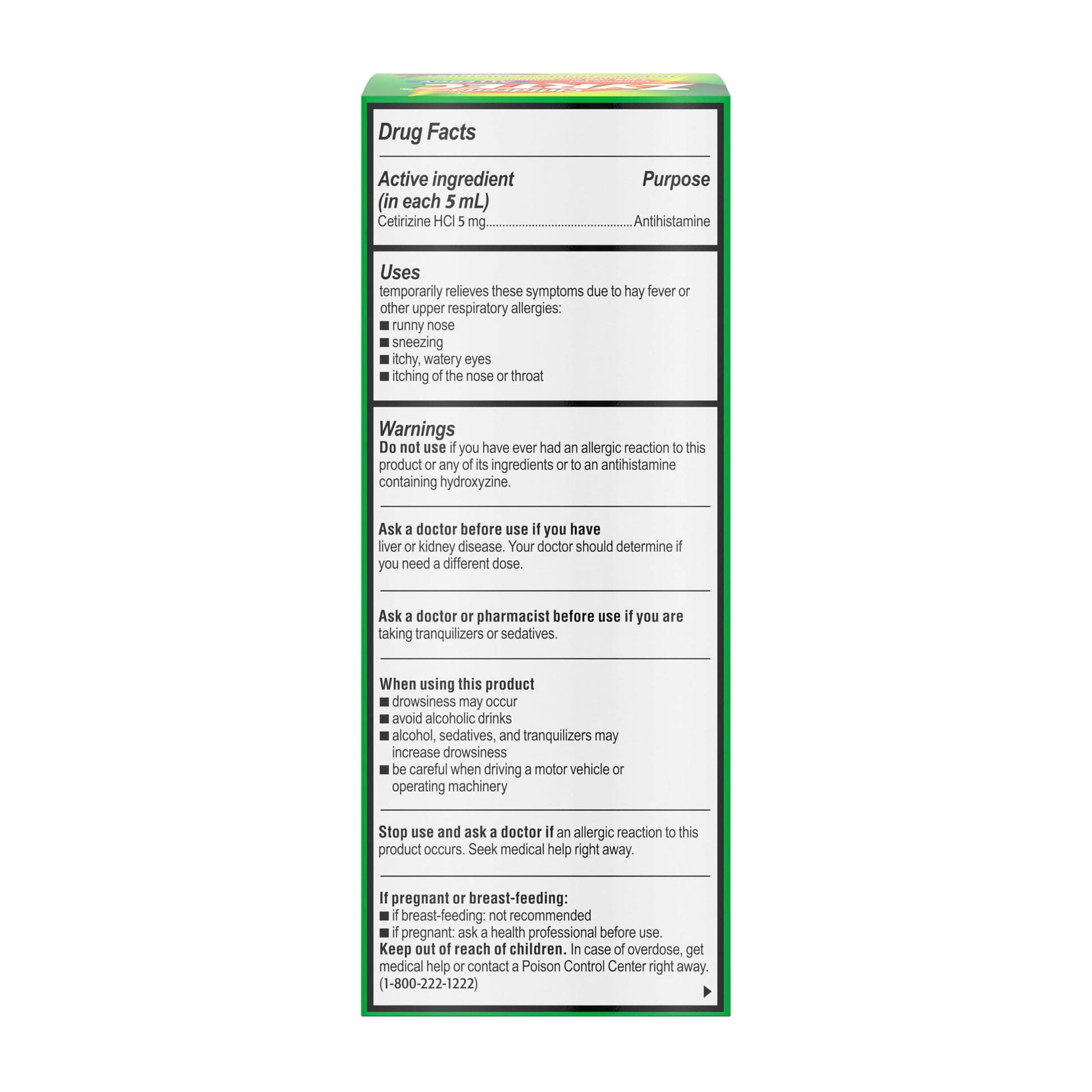 - 8-fluid ounces of Children's Zyrtec Allergy Syrup with cetirizine hydrochloride provides powerful, all-day relief of your kid's indoor, outdoor, & seasonal allergy symptoms including runny nose, sneezing, itchy, watery eyes & itchy nose & throat