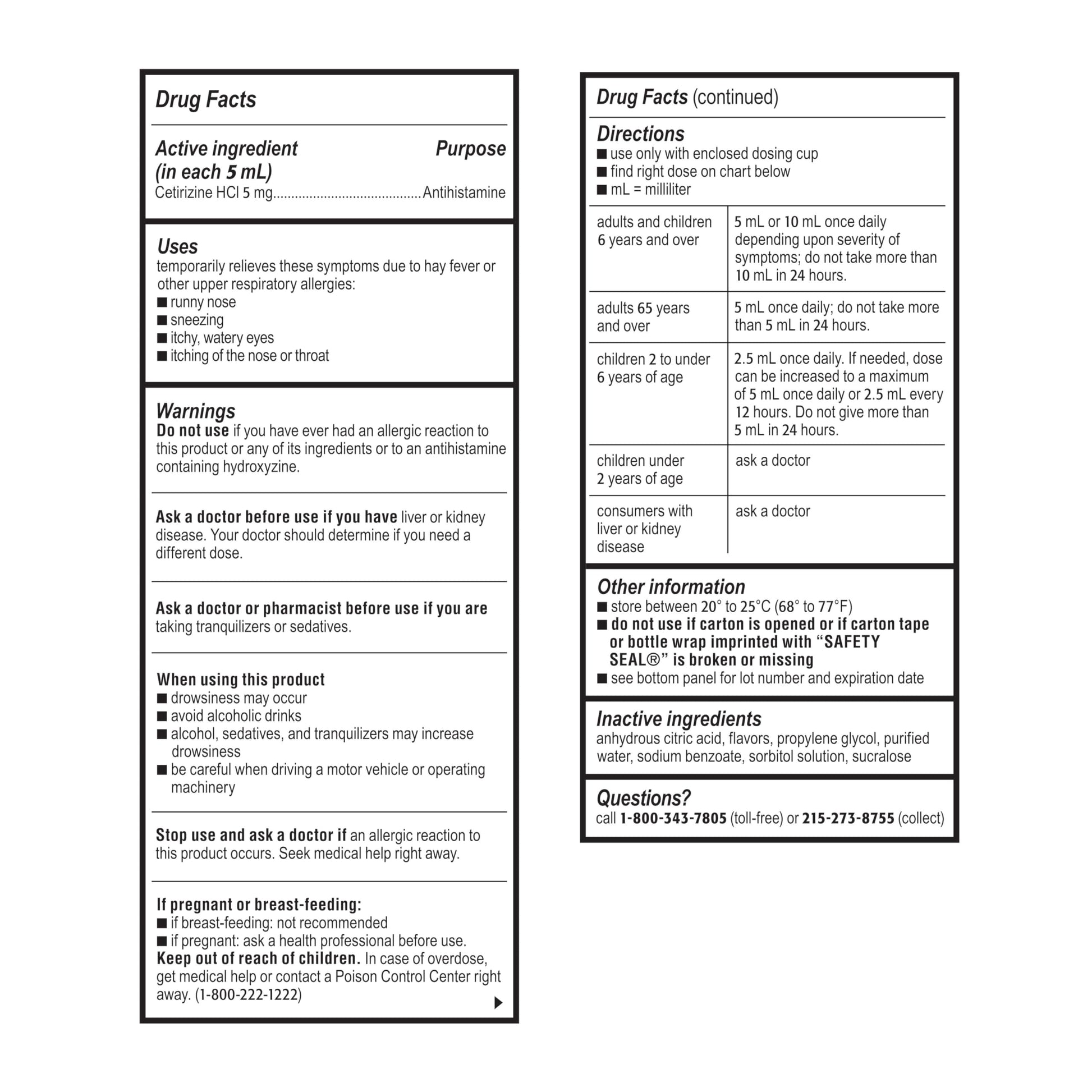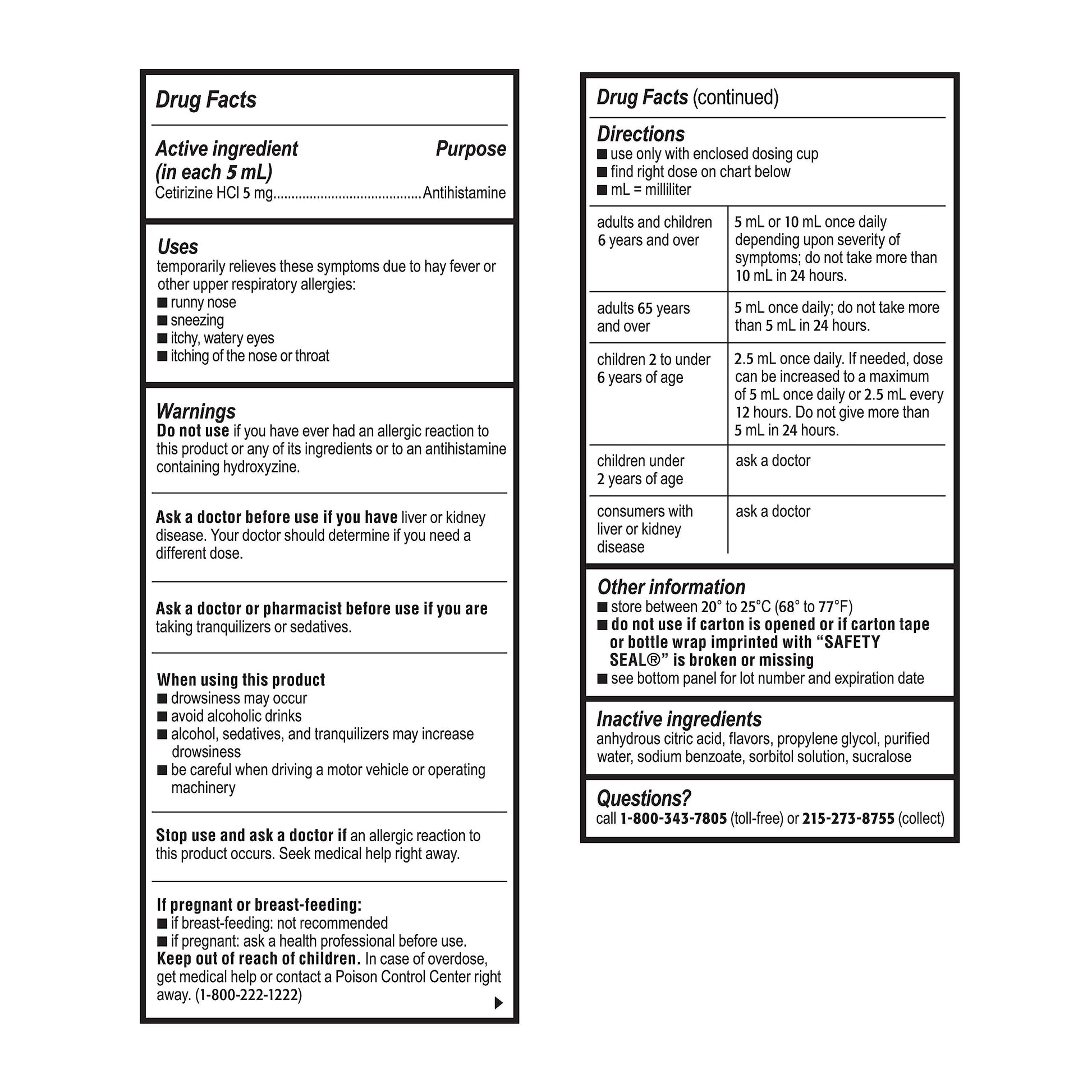 Get powerful relief from indoor, outdoor, and seasonal allergy symptoms with Children's Zyrtec 24 Hour Allergy Relief Syrup. With 5 milligrams of the antihistamine cetirizine hydrochloride in each 5 mL dose, this over-the-counter children's allergy medicine offers all-day, 24-hour relief from common symptoms of hay fever, seasonal allergies, and other upper respiratory allergies. Kid's allergy liquid provides consistently powerful relief for your kids' allergies and helps treat symptoms such as runny nose, sneezing, itchy watery eyes, and itchy nose and throat. Suitable for children ages two years and up for allergy symptom relief, Zyrtec Children's Cetirizine Hydrochloride allergy medicine is dye-free, sugar-free and available in a kid-friendly grape flavor. Kids' liquid allergy relief medication contains no ingredient made from a gluten-containing grain (wheat, barley, or rye)